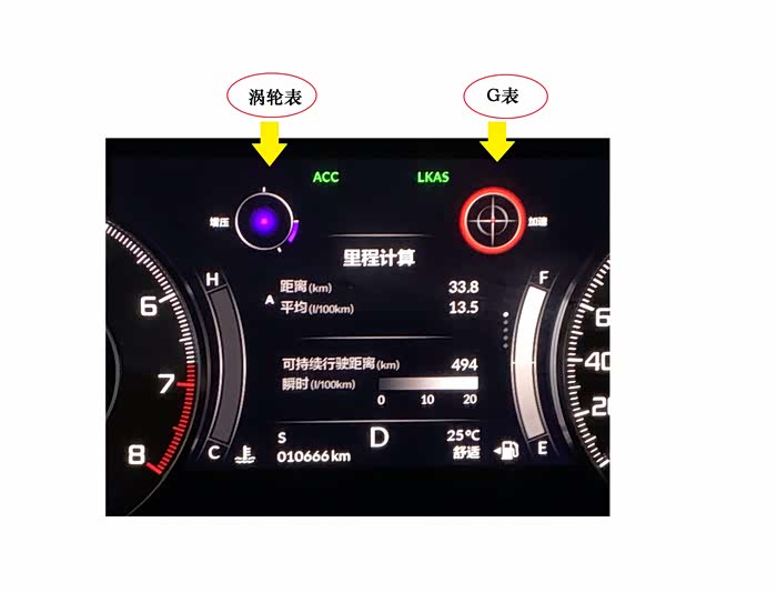 在仪表盘中显示后,我们可以看到这两个圈圈,左边那个是“涡轮表”,右边那个是“G表”,我们先介绍下G表,这个相对比较简单。