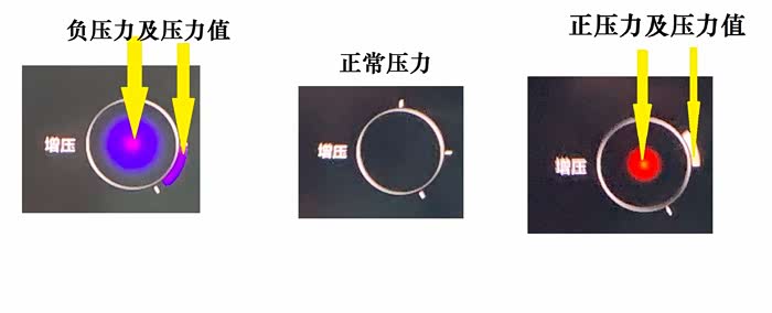 紫色的大小和边上的紫色弧形长度,代表当前压力情况,面积越大代表负压值越高(可以理解为动力越差)