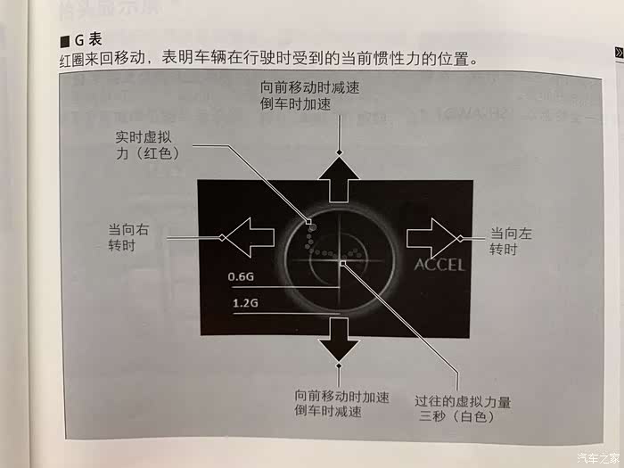在我们开……开车,在我们行驶的过程中G表中会看到两个点,一个红点和一个白点。而G值,就是表示车辆的惯性方向,我们知道物体在运动的时候有惯性,车辆突然起步,突然刹车,转弯,都会有一个反方向的作用力,比如左转的时候车辆会向右倾斜,所以G表表示你车辆的惯性方向,这个有什么用呢?技术人员表示