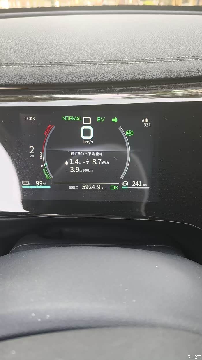目前表显最近50公里的油耗是1.4升+8.7度,约3.9升每百公里,这样的油耗还是挺满意的,用电的情况下,油耗相对会低一些,如果是全程混动模式之下,可能在4.2左右。
