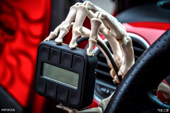 然而作为目前VW品牌旗下最个性也是唯一有个性的车型,金龟车的外观与内装仍旧维持车厂一贯的简单设计,相比同类型车,它的内饰甚至让人完全无法看出这款车主打的是个性。为了不让过于单调的内装过于沉闷,同时也配合风格转变的外观,车主在内装上同样花费了不少心思。首先原本塑胶气息浓郁的彩色饰板被重新装饰,面积较大的部分彩绘上了与外观风格的骷髅图案并覆上金油,保护图案同时提升了质感,面积较小的部分则被车主用红色贴纸手工覆盖。原厂纤细呆滞的方向盘也被更换为粗壮的Golf R20方向盘,大面积碳纤维包裹以及皮革结合处的红色缝线使得其看上去不再枯燥乏味,而位于其左的Airlift控制器支架更是整个内装的亮点,同时也出自于车主DIY的设计概念,由此也能看出他对人类骨骼有著非同一般的情节。