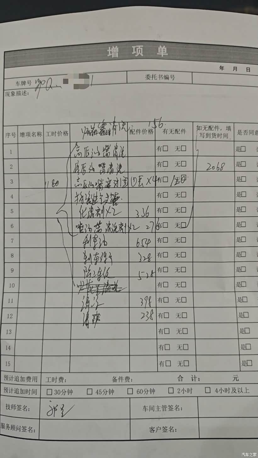 4S店一通检查,说故障报警的原因主要是火花塞有积碳,说喷油嘴喷油不畅,导致有一口缸不工作。给我开的一大张药方,粗略算了一下 要好几千块钱。说这些问题都不在几大件的包修之内,都是需要自掏腰包,那也是哈,再说也超过3年了,准确地说是超过了三年质保期的刚好一个多月。但是4S店的配件价格有点匪夷所思,果断放弃,只做了常规保养准备,明天自己再去找一个靠谱的修车铺处理。