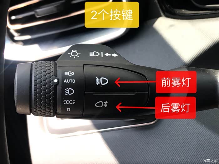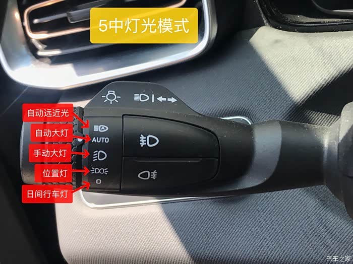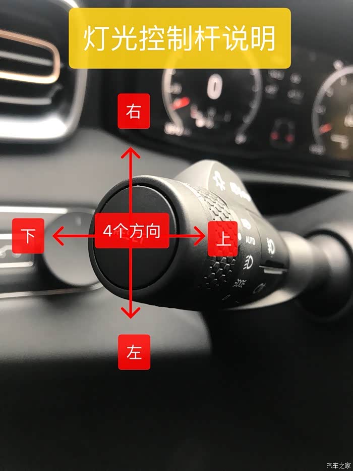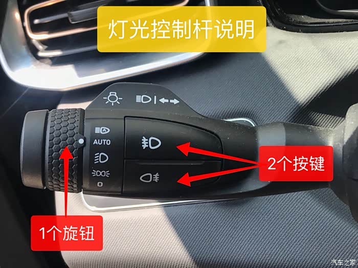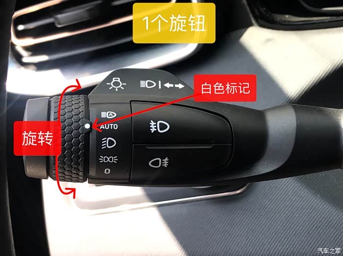 领克外部灯光控制其实全靠方向盘左侧的灯光控制杆。控制杆上有1个旋钮、2个按键,4个拨动方向,为了更直观的展示灯光控制请看图解。(其实还有一个行程清零的reset键,因为与灯光控制不相关,所以这里忽略)