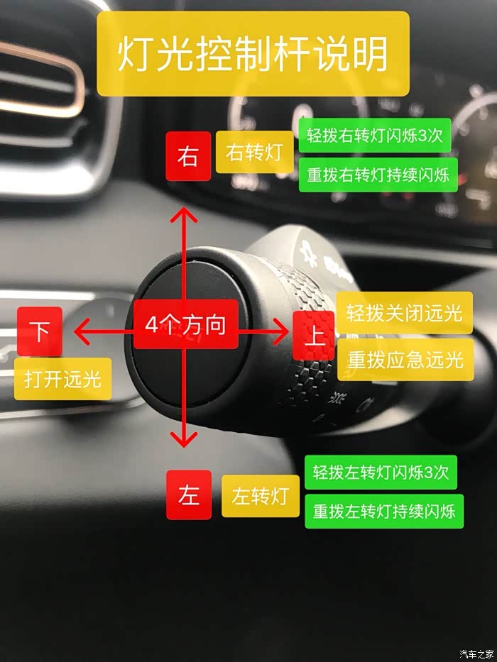 向上:有2个档位,轻拨关闭远光灯、重拨应急点亮远光灯;