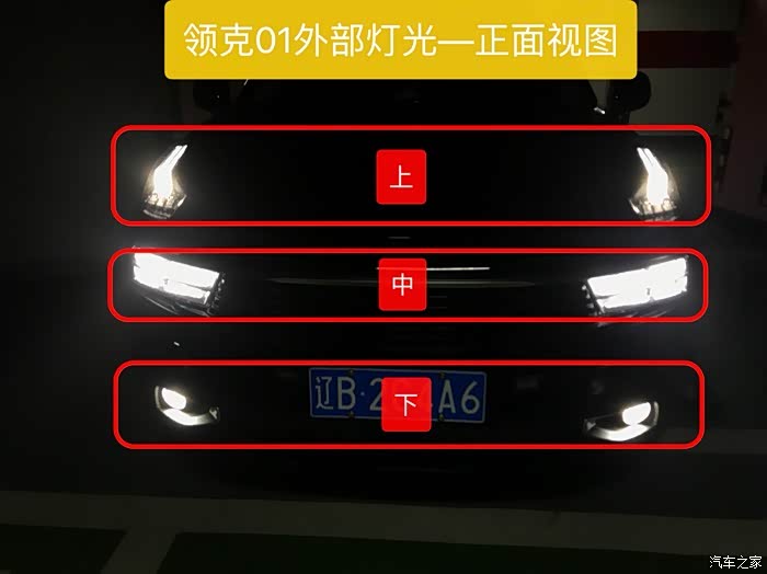 从车辆正前方看,领克的车灯分为上、中、下,三组布局,都市对立美学,你懂的。