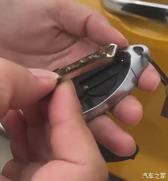 如图所示 首先我们先要把钥匙的后盖打开 因为T99的机械钥匙隐藏在里面 打开的办法也很简单 在钥匙穿线的位置下方盖板处 有一个凹槽 找一个一字板手 轻轻一翘 盖板就打开了 我们就可以顺利的取出机械钥匙