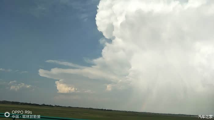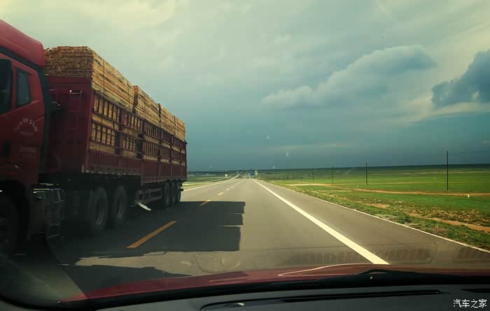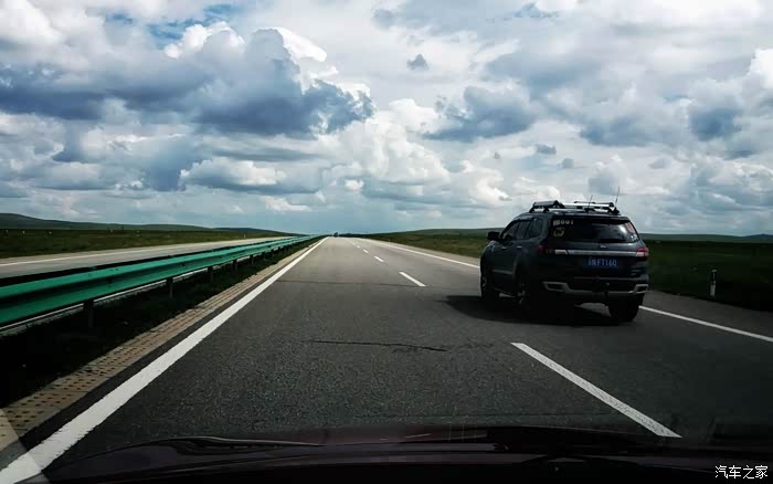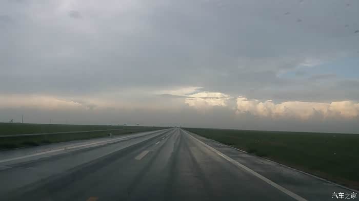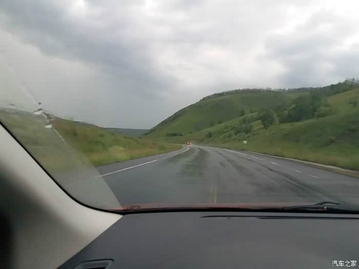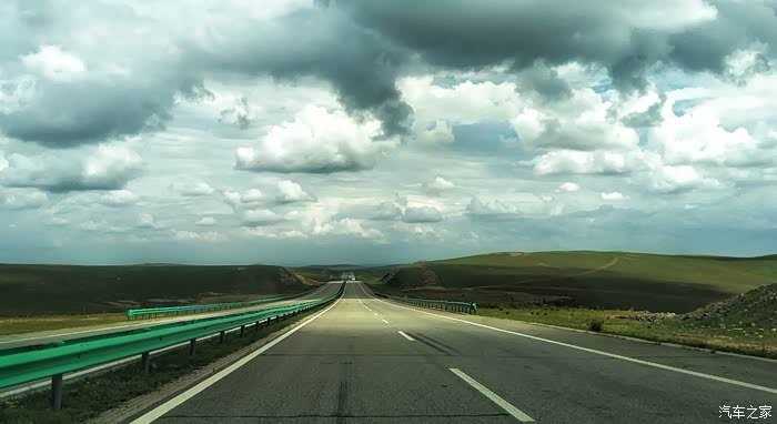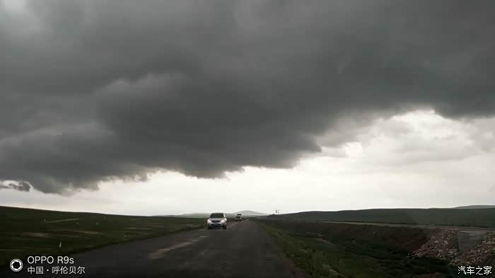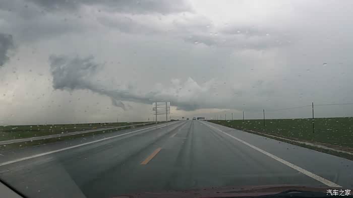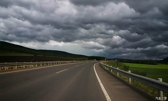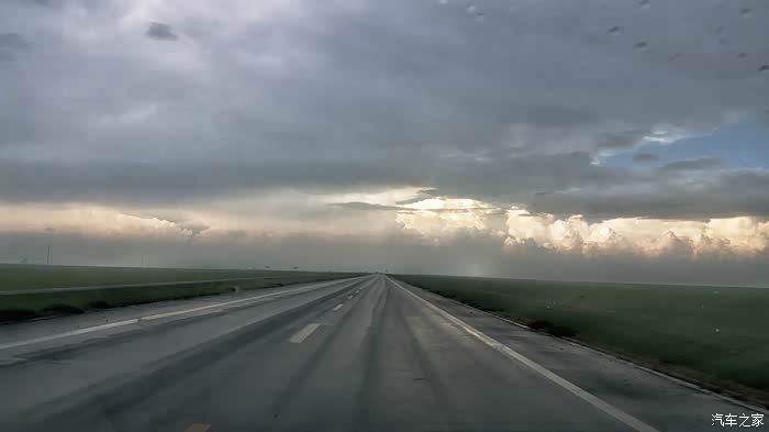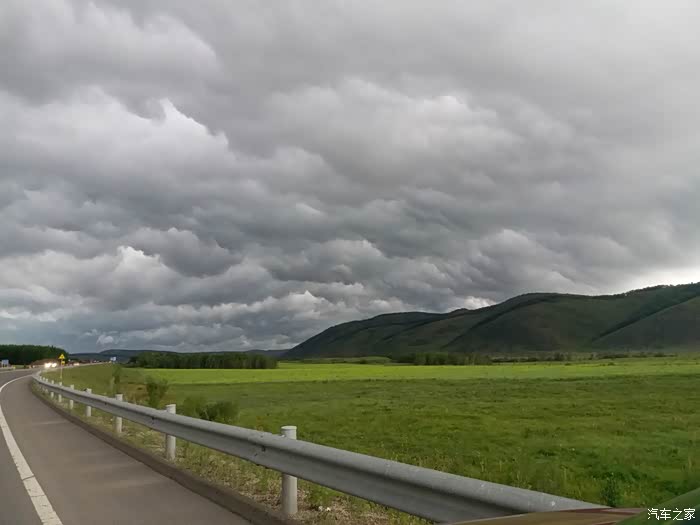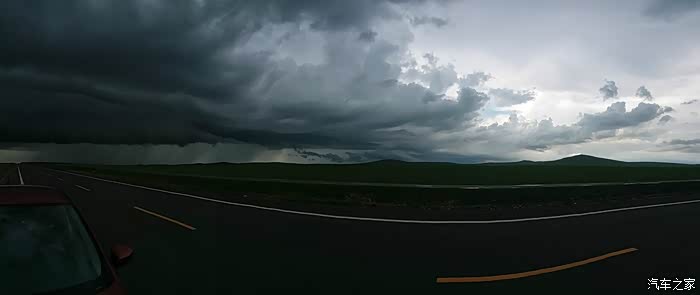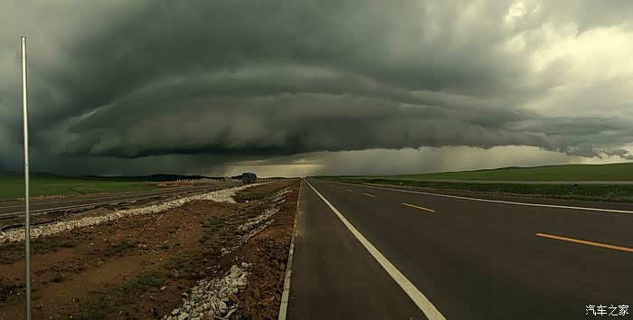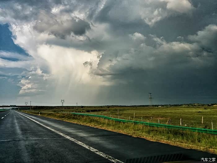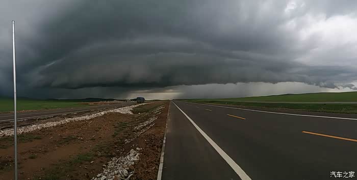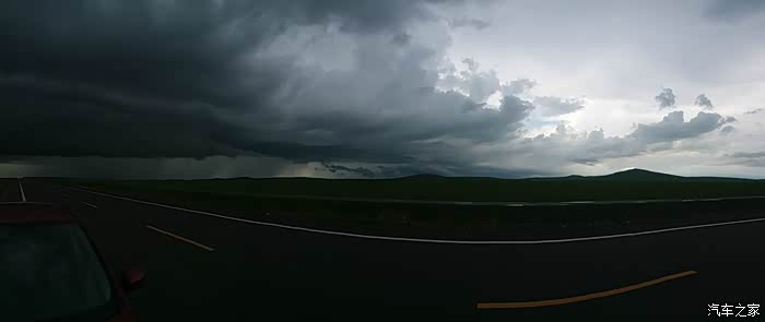 全景一张展现一下这块云团的全貌,公路正好从两个降雨带中间穿过,我说咋后面这段没雨了呢,这种景象中原地带应该是看不到的,这回算是开了眼了,人常说“谁知道那片云彩下雨”,嘿嘿,那是你没来草原..................文章开头说的,如果你在草原上赶上下雨是件幸运的事就是这个意思,当然灾难天气除外。...........我感觉我真的很幸运,这两天都是一天看俩景,上午蓝天白云看草原,午后乌云密布看天空