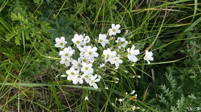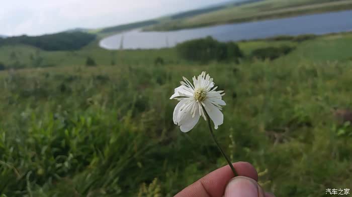 草地上开着无数的小花,很漂亮,下去玩会,摘了几朵闻了闻,这股子韭菜味