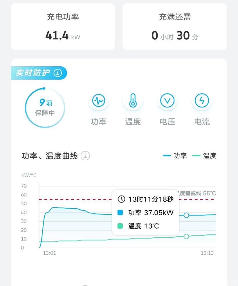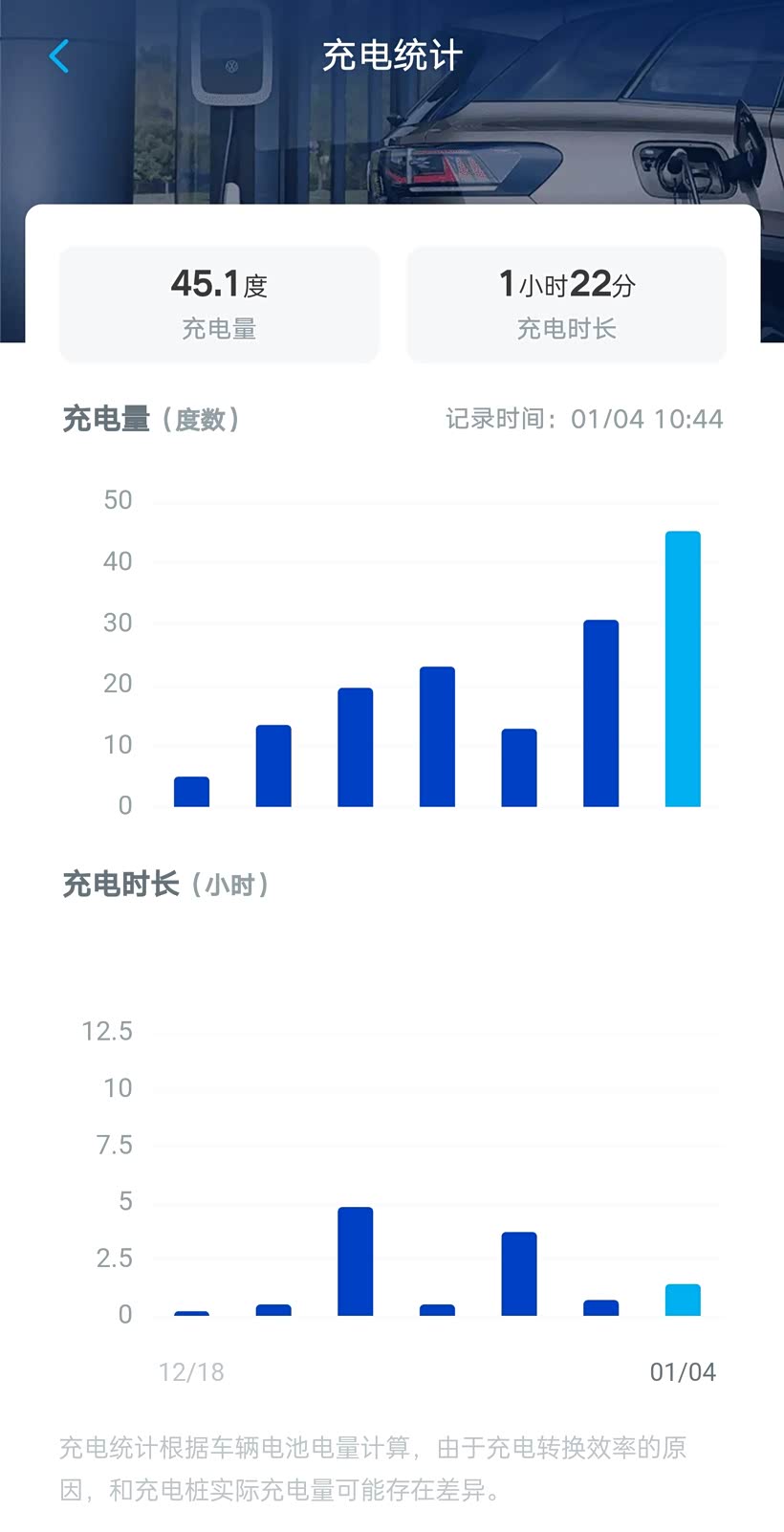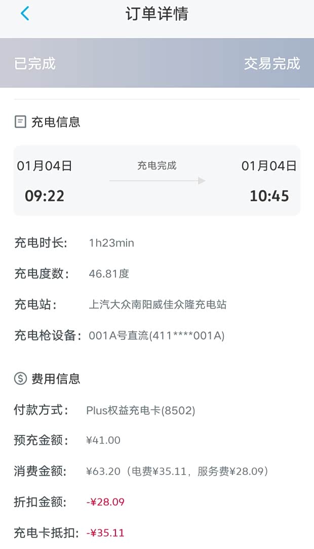 我拿自己的车做了一个实测。先把车辆开至剩余电量8%开始充电,一直充到 100%,充电比率为 92%。用了 1 小时 22 分钟,环境温度6℃,充电功率为40kw。计费系统显示用电 46.81 度,但车机记录实际充进电池包是 45.1 度。