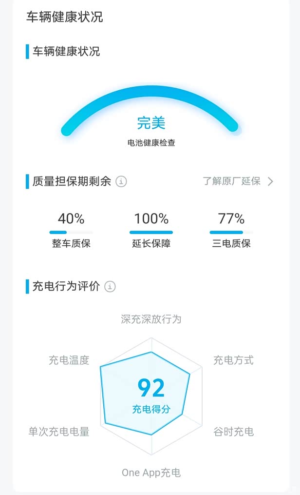 按照上述基准参数原始电池容量是 52.8 度,用现在车辆电池可充入的度数÷基准参数,49.03÷52.8 = 0.9285984848,也就是说,电池当前健康度约为92.86%。这也就意味着经过666天3万公里的行驶,我这台车的电池损耗了7.14%。