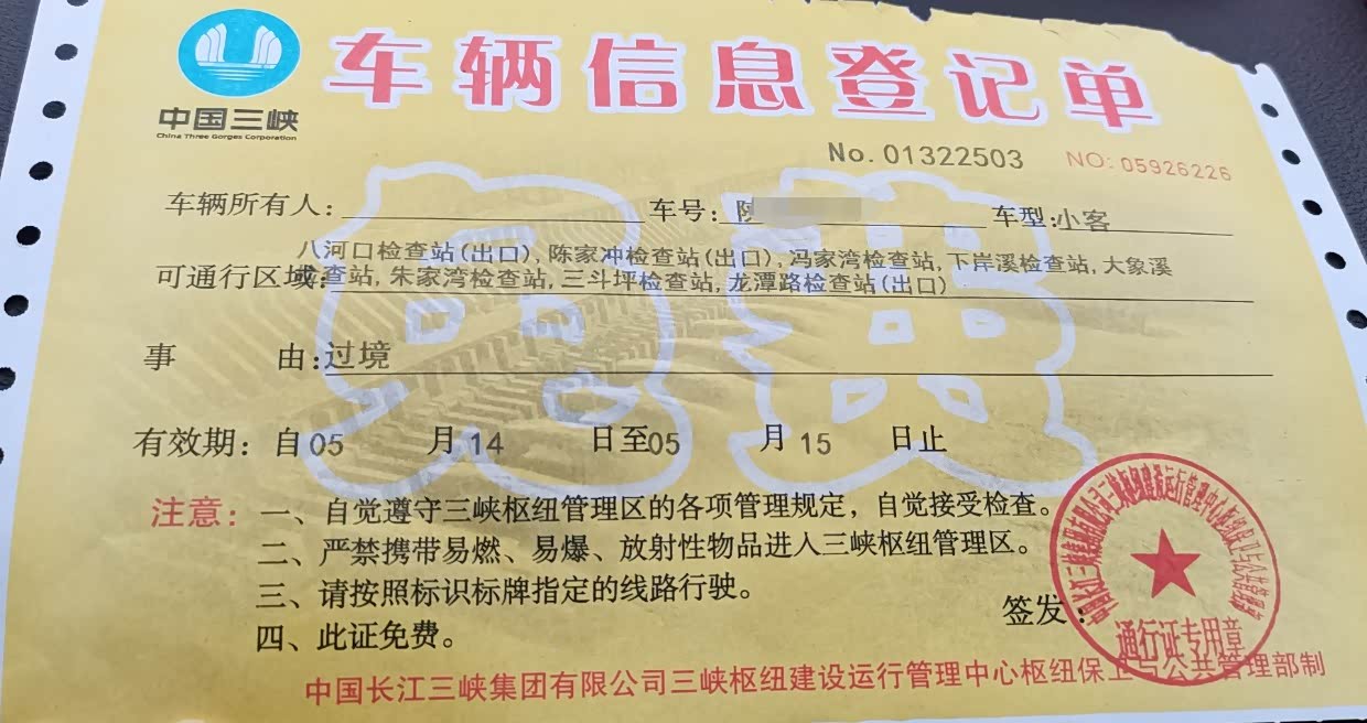 西陵峡大桥要办通行证,在桥头免费办理,需要驾驶证行车证,办好即可通过,这里是通向三峡库区重要之地。所以没有停留拍照。