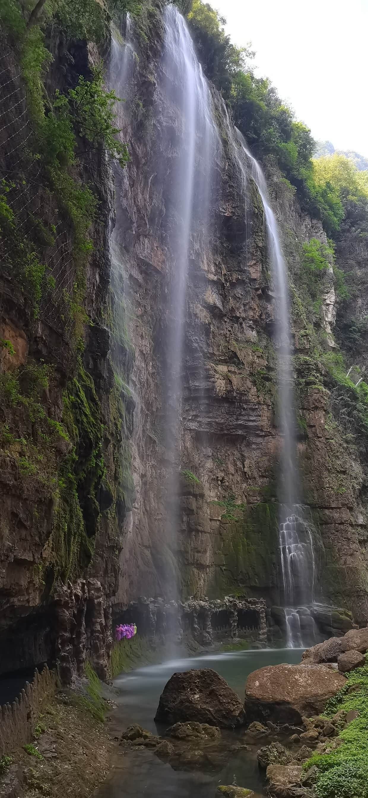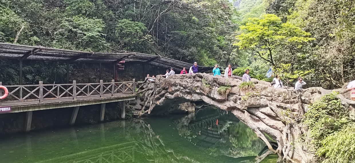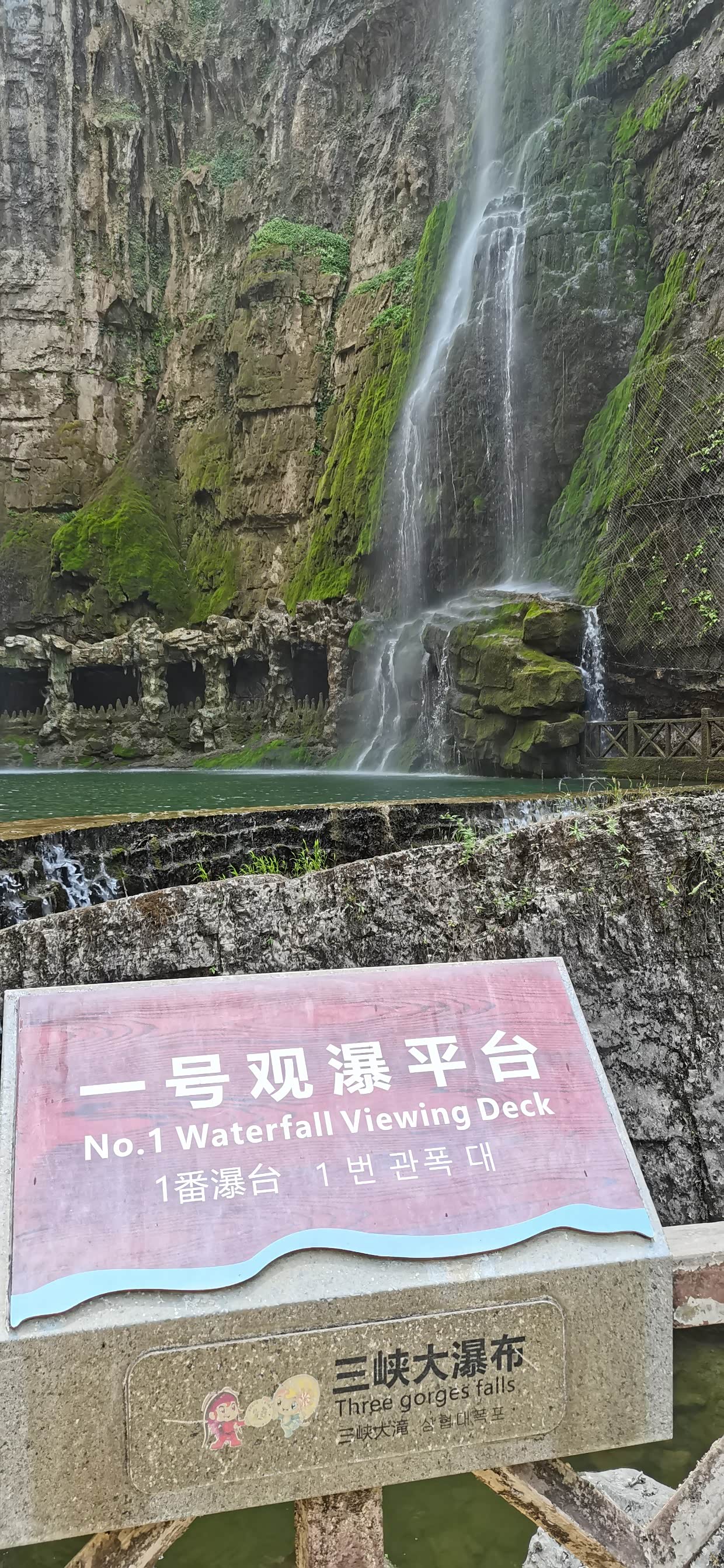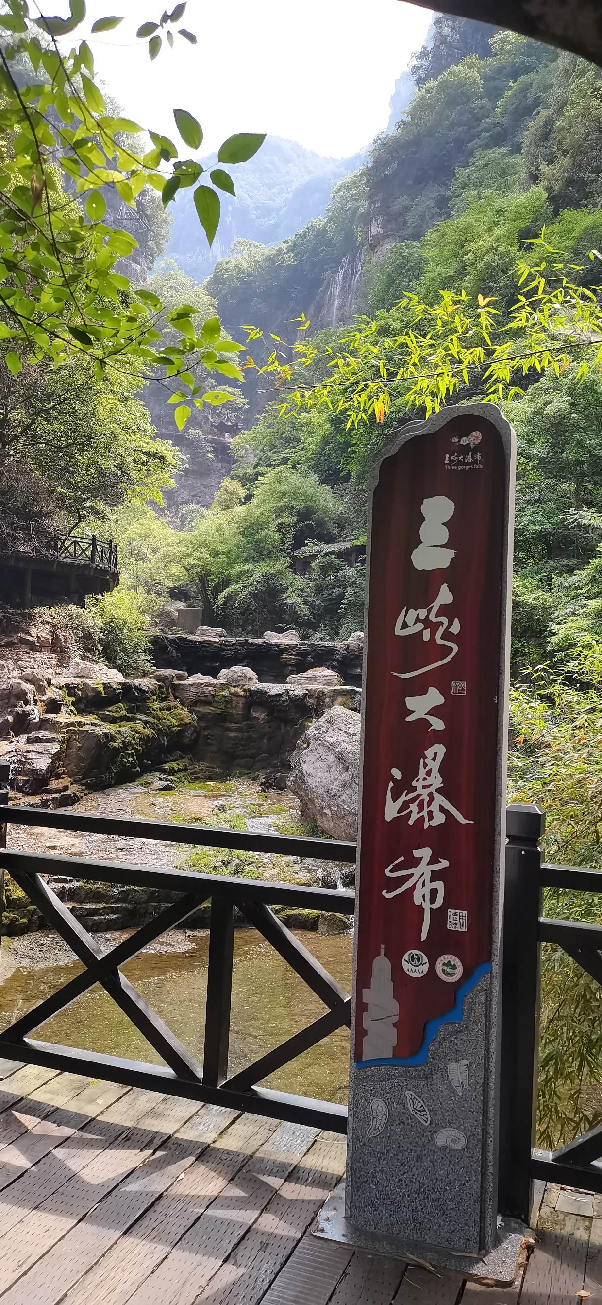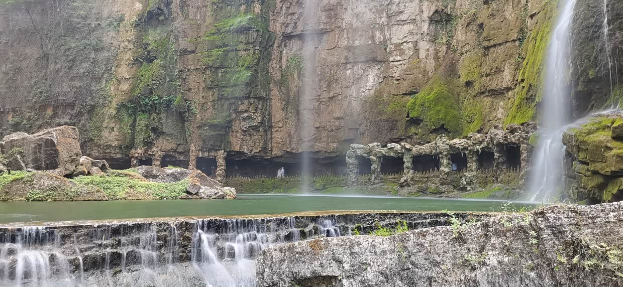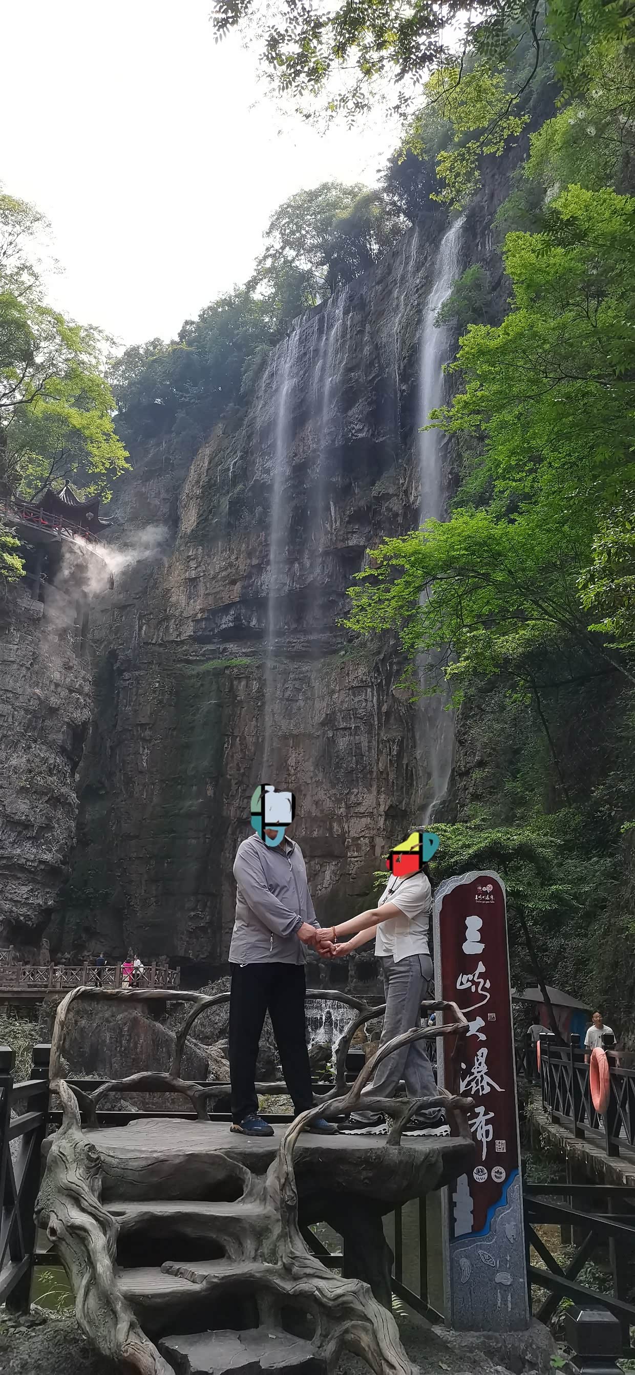 来到景区,先坐景区交通车,然后开始步行上山,坡度不大,台阶也不是太多,对老人小孩比较友好,我们沿路走着,旁边小溪流水不大,沿路小瀑布群流水也是稀稀拉拉,就感觉今天瀑布不大,问了路边管理人员说近期没有雨水,瀑布的确水量不大,但是可以看。来都来了,继续向上攀登,不一会就到了瀑布底下,抬头望去,瀑布水小的可怜,这可是5A 级景区啊,非常失望。不过还是那句话来都来了,感受一下也好。