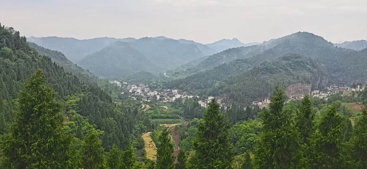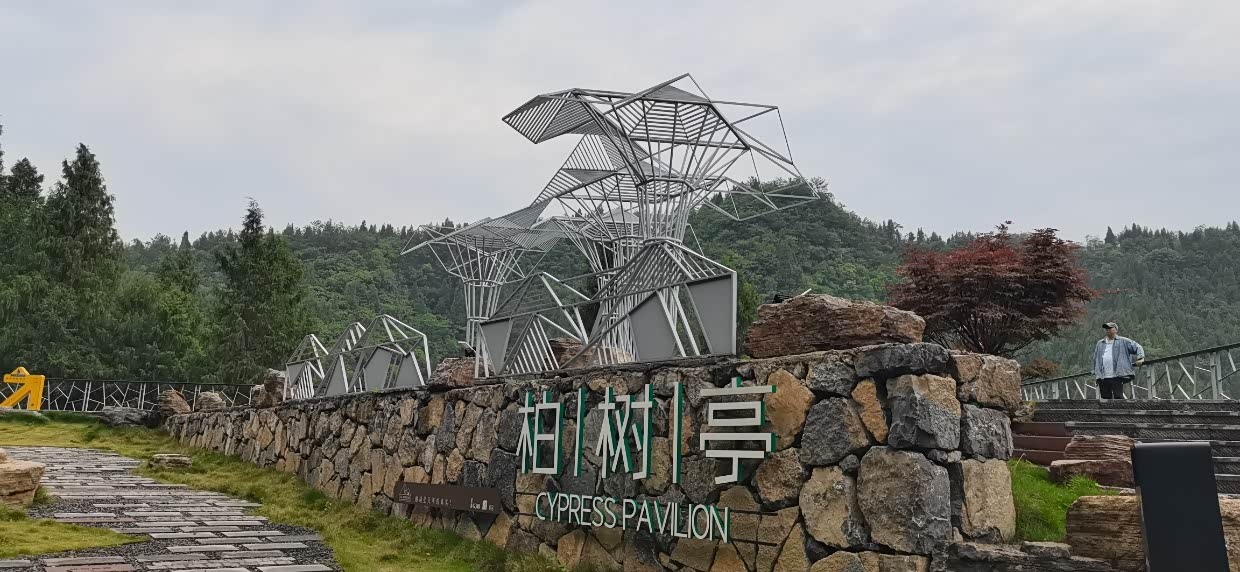 “柏树亭”观景台。黑瓦白墙的村庄与绿意盎然的柏树相映成趣,简单拍摄即可捕捉到乡村的宁静与美丽。