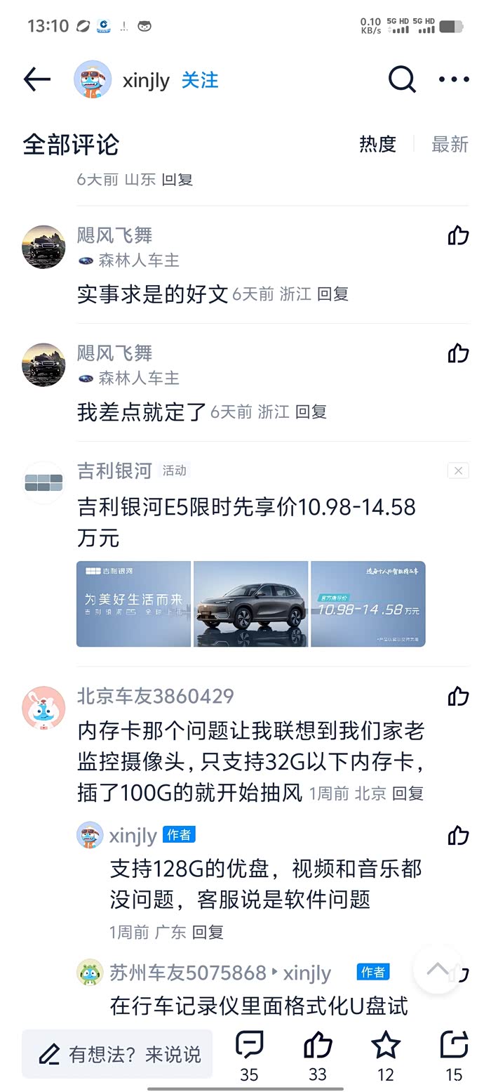 5. 时间:20240605,问题:车载相机一直提示内存不足,但是车机内存还有几个G,现有的照片也无法拷贝到优盘,插了U盘提示要移除,拨下来又让插U盘,整糊涂了。投诉客服回复是系统bug,至今未解决。【图3】