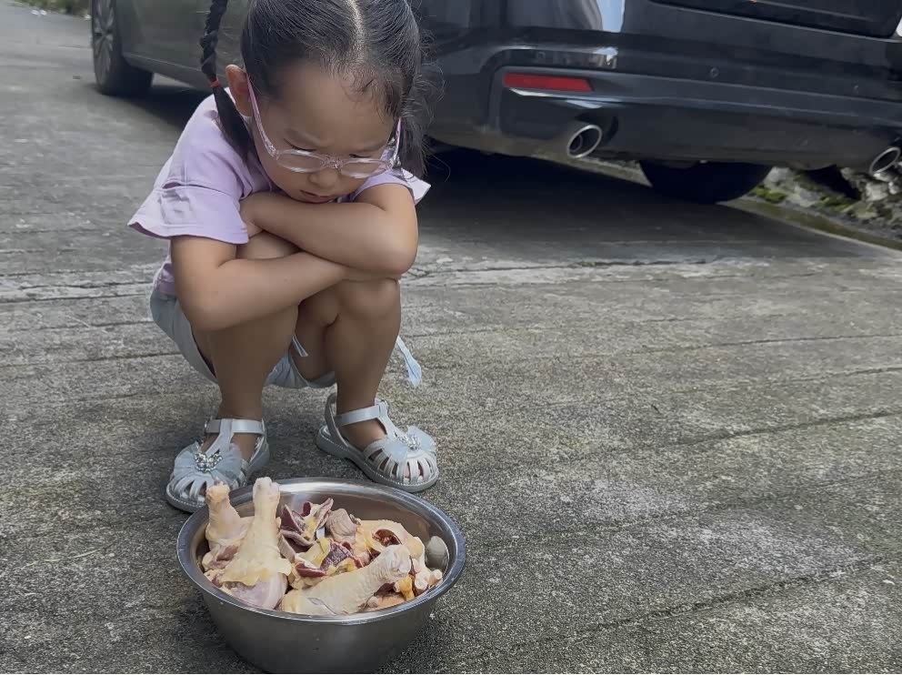 抓了一只最大的老母鸡,宰杀过程就跳过了。小宝平时喜欢喂鸡,看着朝夕相处的小伙伴变成盘中餐,小朋友伤心了好一会。