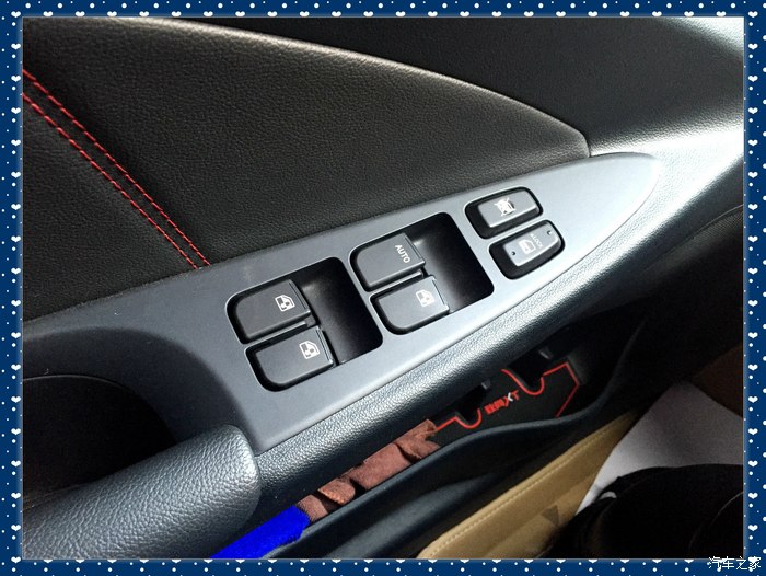内饰:黑色和米色内饰还算顺眼。座椅的黑红配色也是我买这辆车的原因,蓝光背景仪表盘,真皮多功能方向盘,音响效果不错,音量15已经非常大声了,还有点震的效果。电动天窗在天气好的时候开着不错,后排中间扶手,眼镜盒都很有用。中央2个茶杯座,门上还有,比较周到。