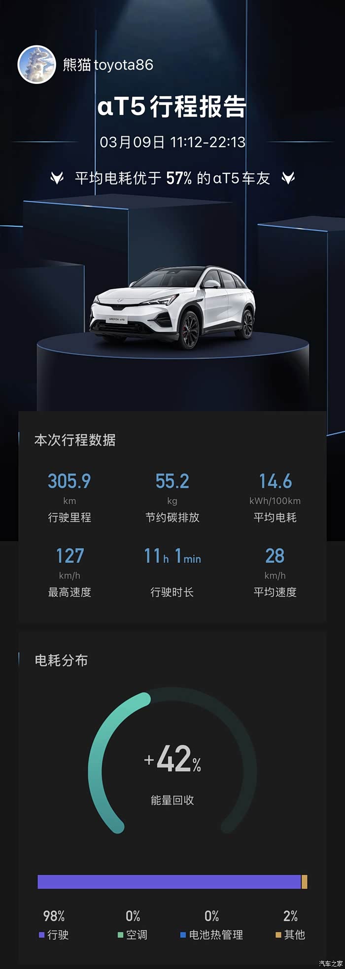 极狐T5在节能方面的表现也相当出色。从行程数据就能看出,每次出行不仅能节约大量碳排放,而且平均电耗也很优秀。因为习惯用单踏板模式电耗非常优秀14kWh左右电耗,行程同样表现不错,这不仅大大节省了我的出行成本,更重要的是减少了对环境的污染。