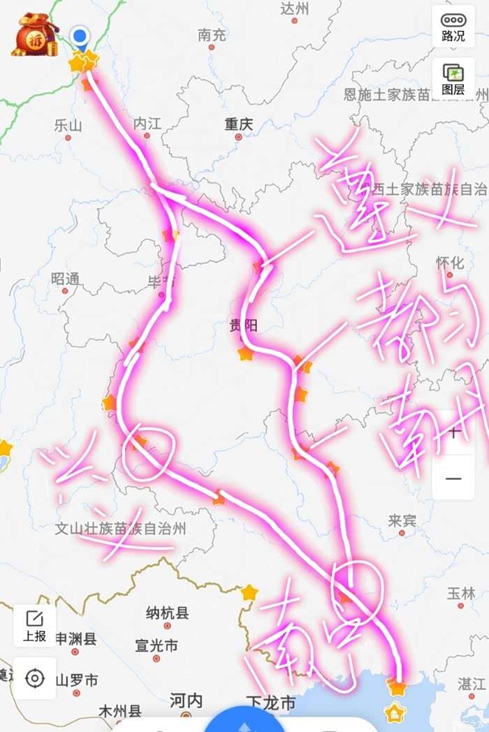 计划路线:成都-毕节-六盘水-兴义-百色-南宁-北海-涠洲岛-北海-南宁-河池-南丹-都匀-遵义-成都。