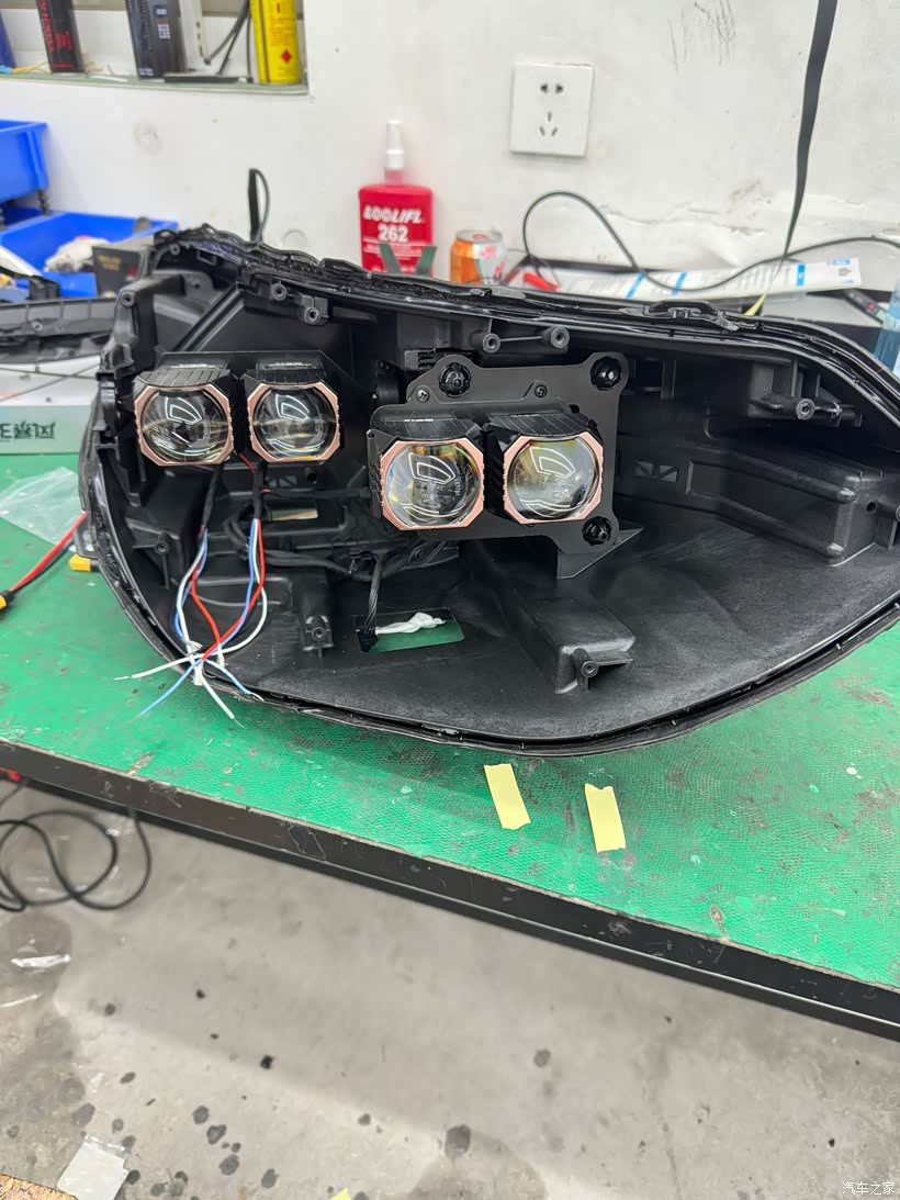 模组固定好之后,就是接线和调试了。师傅说澳兹姆的这款模组是专车专用的接口,不用破线,直接对插就行,这样既安全又不会影响车辆的质保,这一点我特别满意。接线完成后,师傅先把大灯总成简单装回车上,然后打开灯光,开始在墙上调试切线。