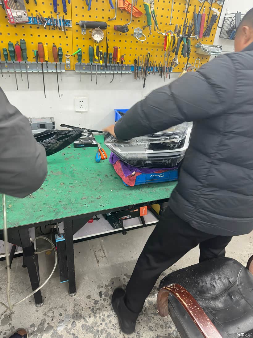 调试完成之后,师傅把大灯总成重新密封好,这次用的是进口的蛇胶,密封效果比原厂的冷胶还要好,不用担心以后会进水起雾。密封好的大灯总成再装回车上,师傅又仔细检查了一遍所有的线路接口,确保没有松动,然后把保险杠和其他部件都复原归位。