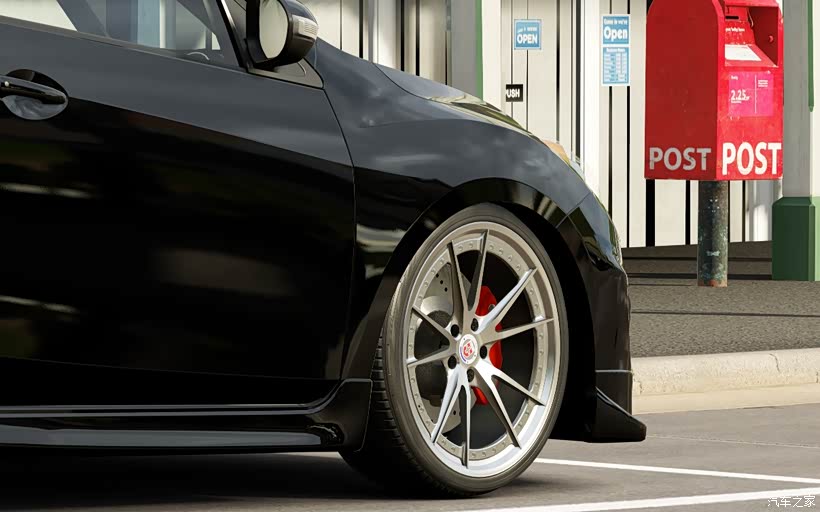 侧面部分可以看出增加了侧裙,降低了悬挂,还把17寸的原厂轮毂换成了19寸的HRE轮毂。轮毂的条幅变得更细,也有细细的抛边,大大提升了观感。另外,刹车也有升级。刹车盘换成了更大的且带纹理的,卡钳也换成了多活塞的。