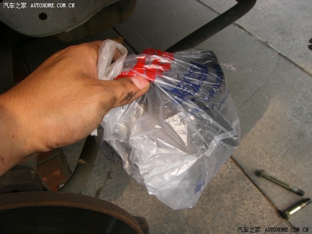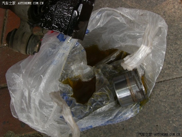 听取热心车友的建议,在将活塞压出来之前,先用塑料袋把分泵包起来,为的是防止刹车油嘭得到处都是