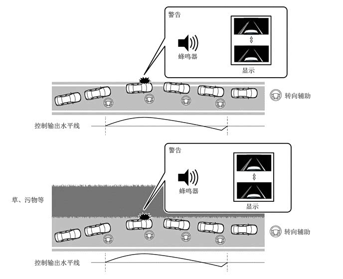 如果功能判断车辆可能偏离所在车道或车道界限,则进行转向辅助以帮助驾驶员校正车辆路径。如果驾驶员未采取相应措施,则闪烁多信息显示屏上的车道标志并鸣响蜂鸣器。