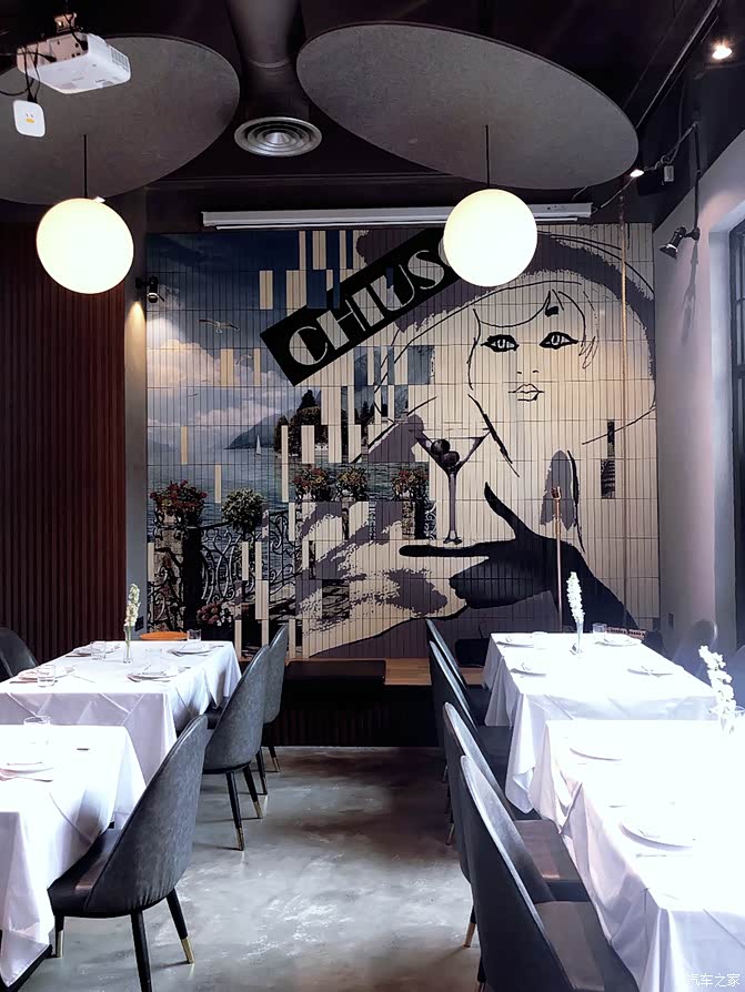 大幅度的落地窗,搭配意女郎墙画,特设而制的酒柜,球形吊灯洒柔光,灰色的沙发和覆盖着白色桌布的木质桌,简单而优雅,耳边轻轻地回荡着《像天使一样的美丽》曲调。