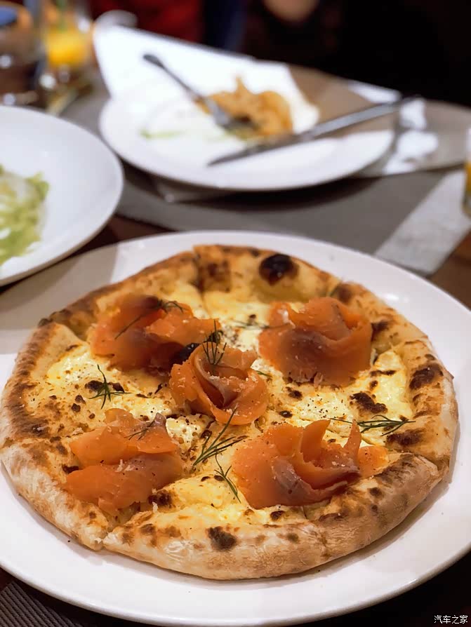 #烟熏三文鱼披萨#不同于美式厚底披萨,它家这披萨只有2mm的薄底披萨,超软的饼底,烘烤后口感酥脆,拉丝的奶酪,令人愉悦的烟熏三文鱼,一口下去超满足。