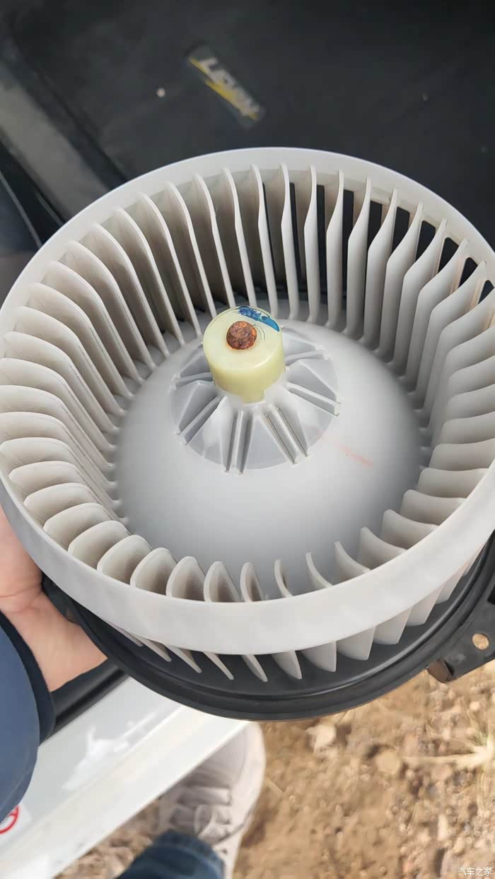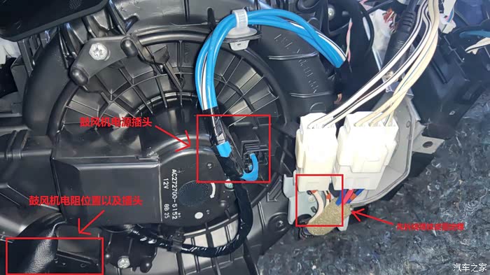 四、拔掉线缆插头后拿出鼓风机,需要慢一点。防止把风机叶片损伤。然后再将电阻器拆下来,两颗螺丝。注意要记好电阻器安装方向。