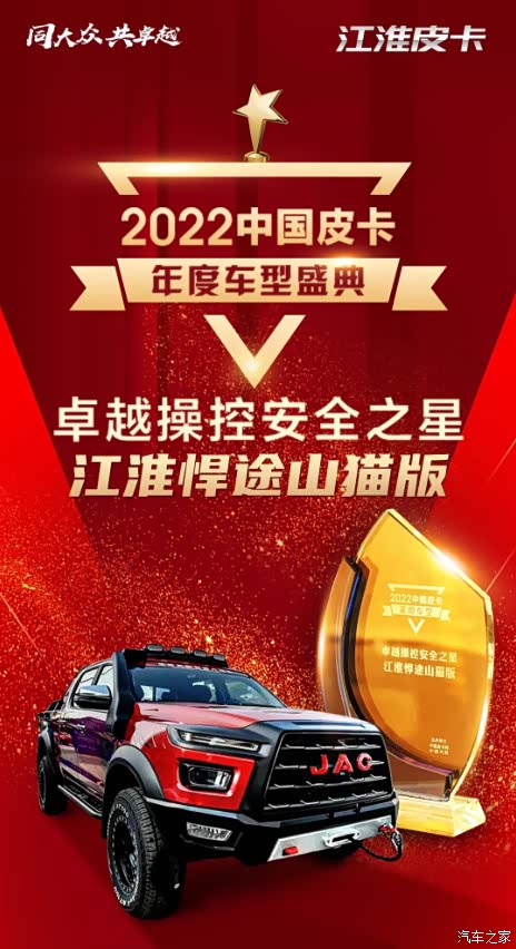 2022年1月17日,由中国皮卡网、中国汽车工程研究院股份有限公司主办的2022中国皮卡年度车型盛典正式召开。在经历了由中国汽研检测工程师团队的客观评测,以及来自3位汽车行业专家教授和4位中国皮卡网资深编辑的主观考验后,江淮皮卡悍途山猫版凭借出色性能斩获“2022中国皮卡年度车型卓越操控安全之星”奖。