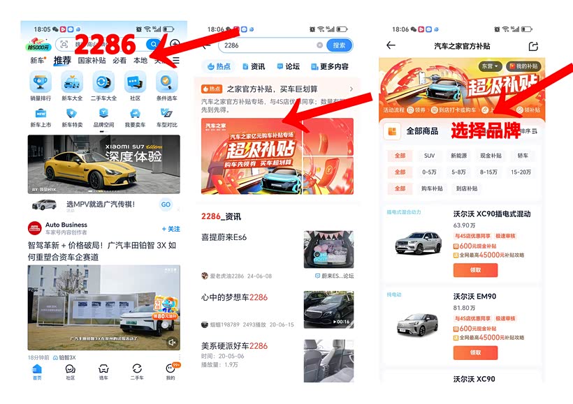 方法2:打开汽车之家App,搜索2286,点击超级补贴活动进入,输入想要购买的车型点击领取。