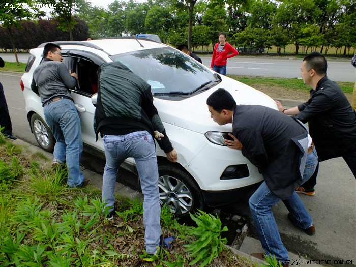 到达目的地,景点人太多,马路两边顺序停车,一车友右前轮不注意掉入坑中,男人们都来帮忙。