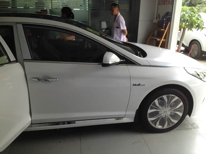 现代展区,索九钜惠3年零利息什么的,看着挺诱惑的,围着车看了半天,有些诧异的是居然没人理我们,走了!这一路逛啊逛的,峰回路转,再到现代展区,再看索九。正常来说,看车讲究眼缘,这次一看,感觉是相当可以的嘛,两次的擦肩而过,让我看到了索九的魅力!和老婆琢磨着,目标明确已然明确,过去再次审视,到处摸了摸,按了按,后排的宽和全景天窗是我老婆的最爱。接下来谈价开始咯,销售让我们先看看配置单,最初我们按照预算首选了1.6领先,正在对比配置时,老婆终于爆发了,来了一句“要1.6尊贵的嘛”,我们没反应过来,“尊贵型,我们的预算不够呀”,一顿缘由和配置对比后,下了决心!