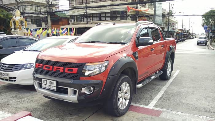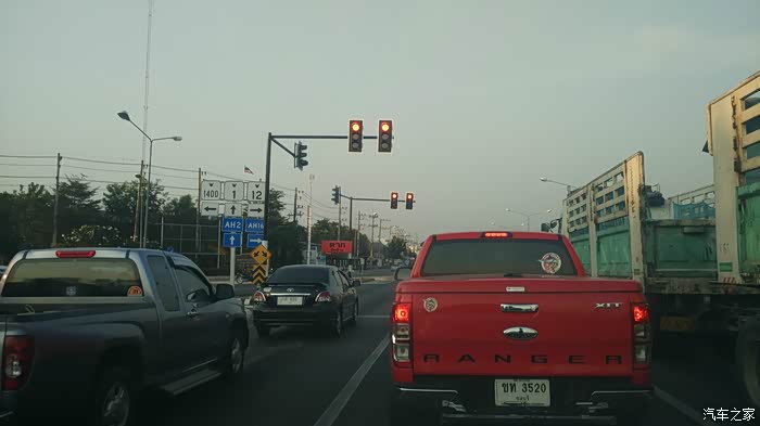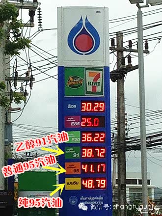 到了泰国,口岸门口就有加油站,泰国加油站很多,尤其是国道两旁几乎几公里就能遇到一个加油站,人口密集地区一公里好几个加油站,比我们这的超市还多。如下图所示,泰国汽油是按颜色区分的,国内加97的,在泰国就加最下面的95号黄色(不是所有加油站都有95号黄色),95号分黄色、橙色两种。国内加93的可以加95号橙色和91号汽油,柴油是第一个深蓝色的。E85和E20是乙醇汽油超便宜,不知道是什么车用的。