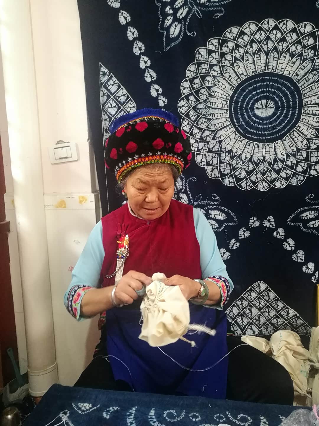 这两块扎染就是我选的,让白族老人帮忙缝制然后染出来的。
