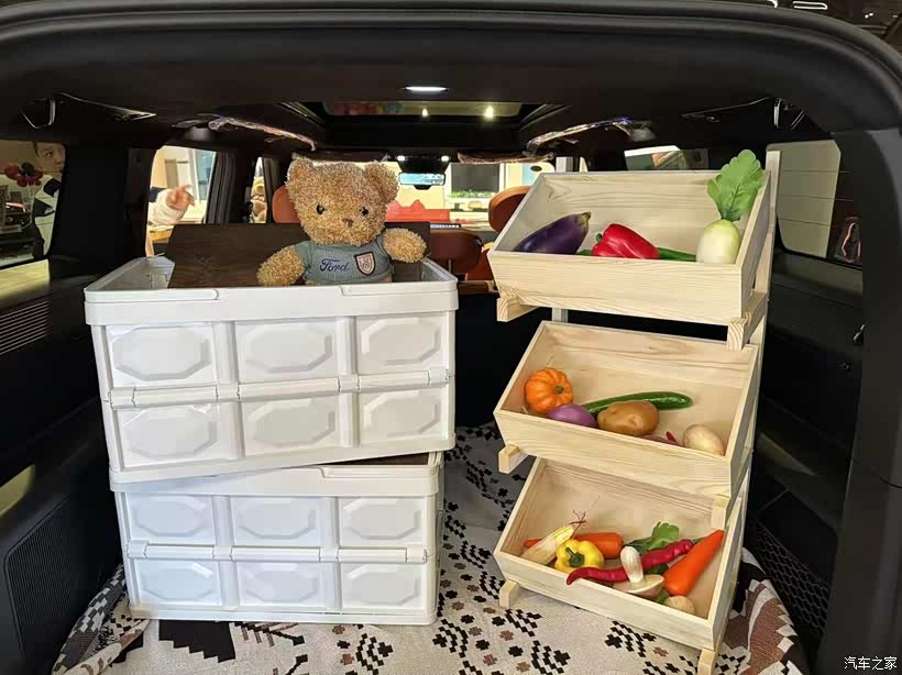 后备厢门是侧开的,下面藏了个小桌板,展开就能当操作台,老婆说“以后露营切菜、放烤盘正合适”。尾门上还有几个磁吸式的卡扣,估计会有官方的拓展件。这小桌板配合上外放电,妥妥一个移动的厨房。