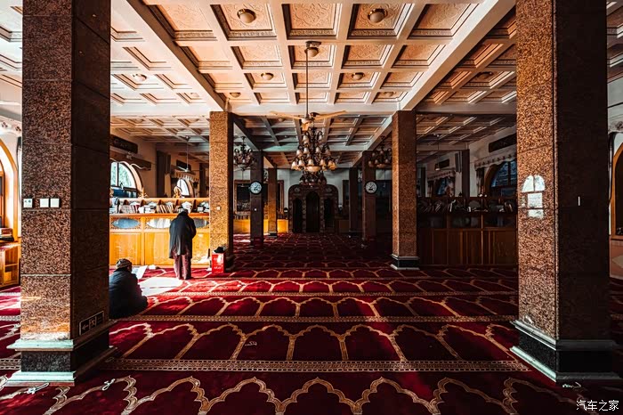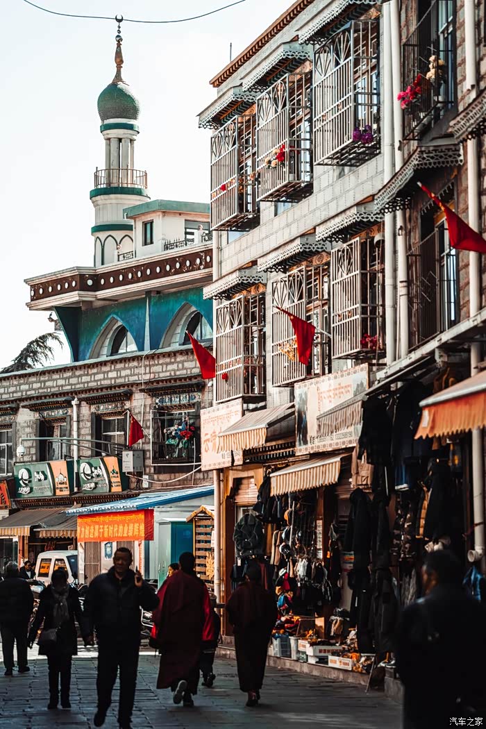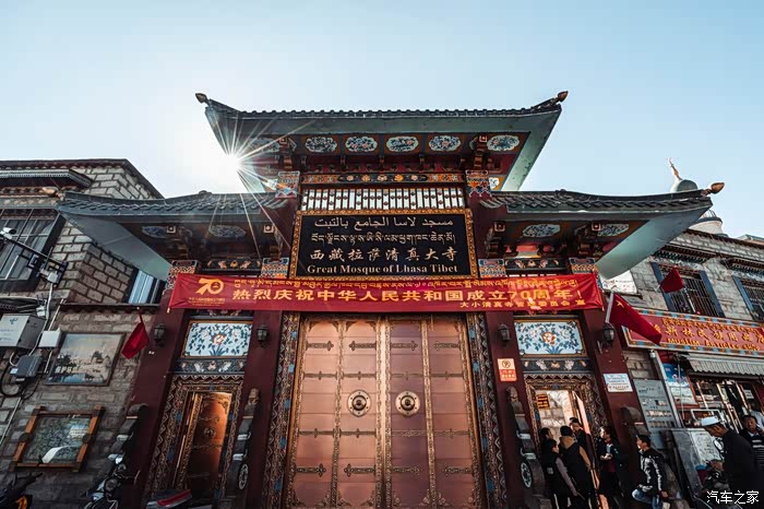 清真寺和大昭寺仅仅几街之隔,突然画风一转,让人觉得反差极大。但因地处佛教圣地,所以建筑风格上不仅突出了圆顶塔楼的雄伟气势,又以西藏传统建筑风格的色彩及门面装饰加以点缀,充分体现了不同民族宗教文化的和谐共存。