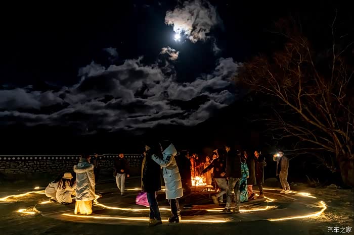 在索松客栈,饱餐一顿后,老板生起一团篝火,印着山景,听着藏语Disco,大家围着篝火载歌载舞,哪怕是零下的气温也能感受一丝温暖。