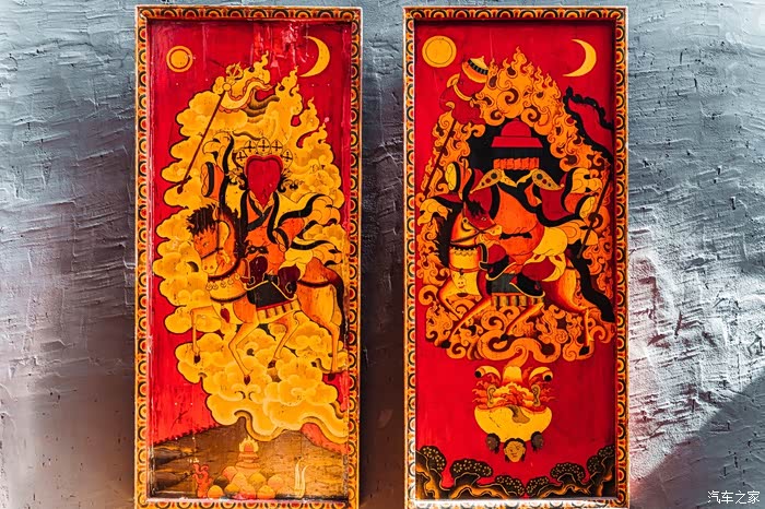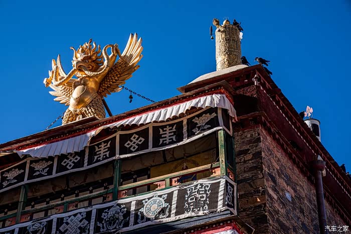 在寺庙主殿的一侧,有一尊金色的带着翅膀的巨鸟——大鹏金翅鸟。这是三世诸佛智慧与方便的显现,密宗中任何愤怒本尊的顶上空中都飞翔有大鹏金翅鸟,它嘴中含蛇,表示遣除末法时期佛法的一切违缘,降伏一切的魔障。不要以为鸟就是好欺负的,大鹏金翅鸟以龙为食是家常便饭。