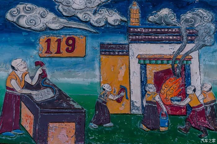 主寺的门口有这样一副彩绘引起了我的注意,大概就是描述寺庙如果着火,应该怎样灭火。拨打119,也算是与时俱进。