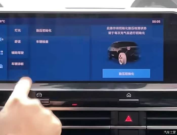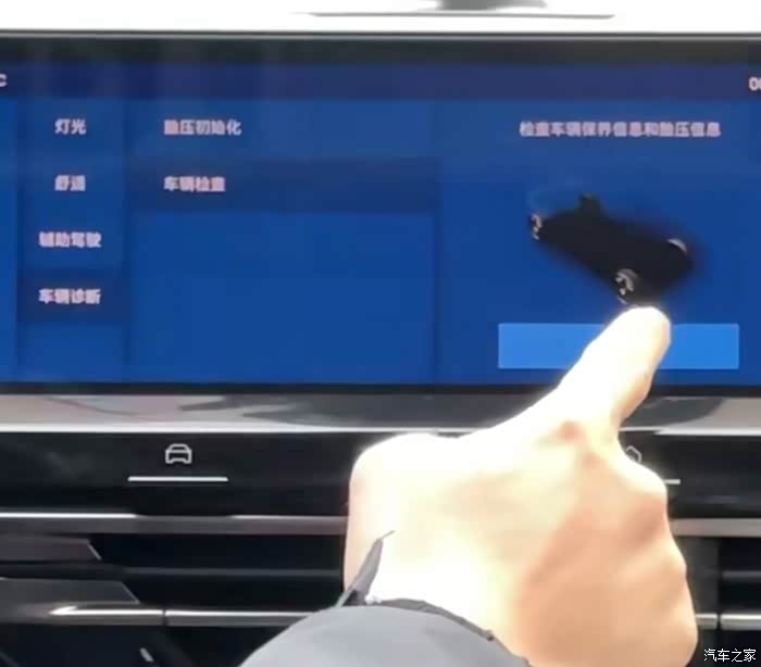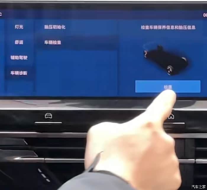 其实,我们还有更好的办法,在车里直接检查出是哪一个轮胎缺气,然后下车直接检查该轮胎立刻,省时省力,效果高很多。具体方法是这样的:滑动主屏幕→车辆→车辆诊断→车辆检查→检查,仪表屏幕上就可以显示出四个轮胎的胎压情况了,我们根据提示直接去检查该轮胎和补气就行了。