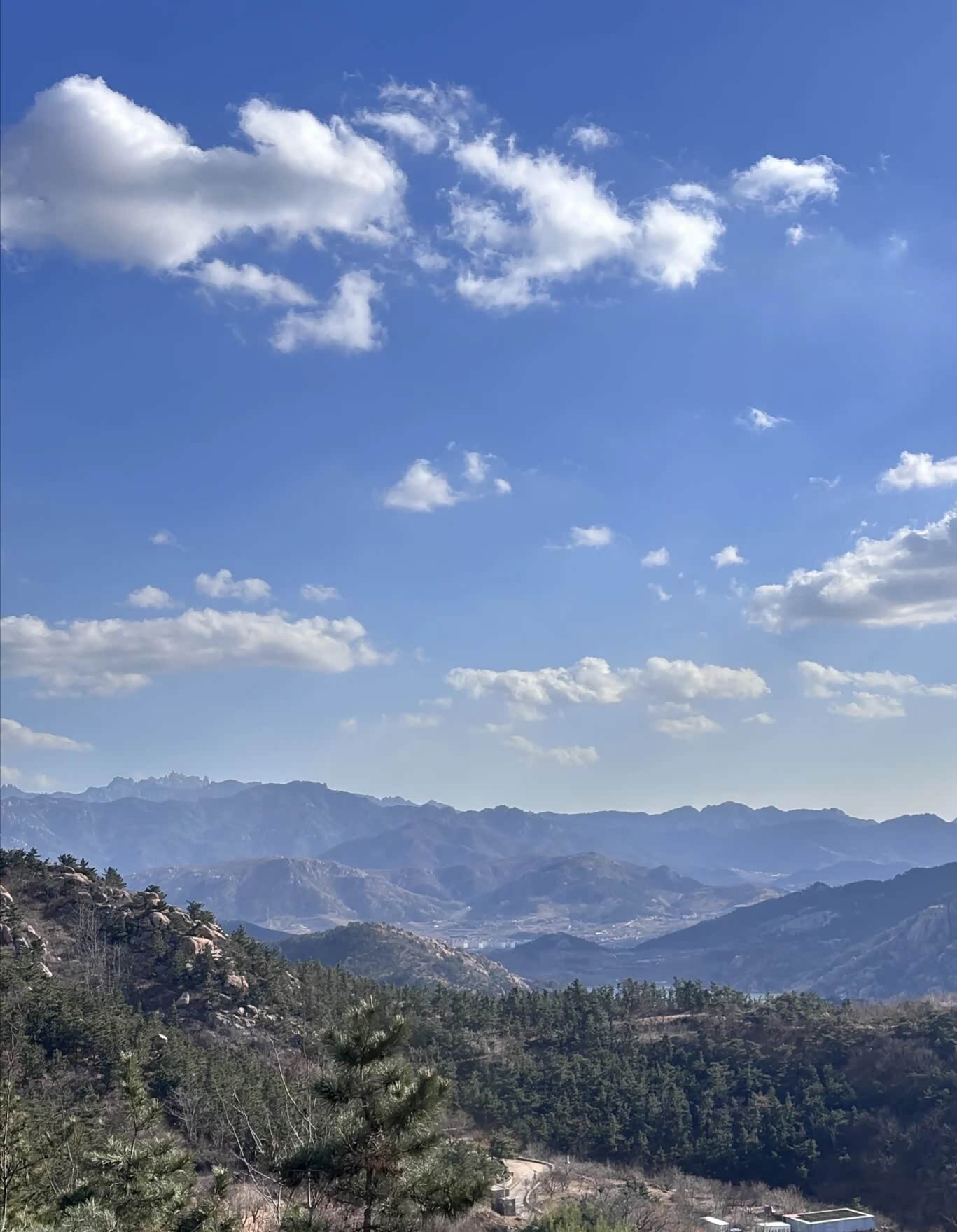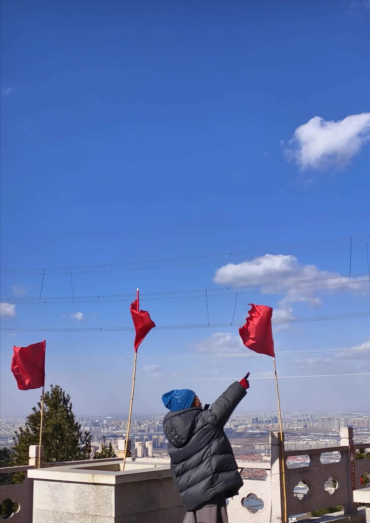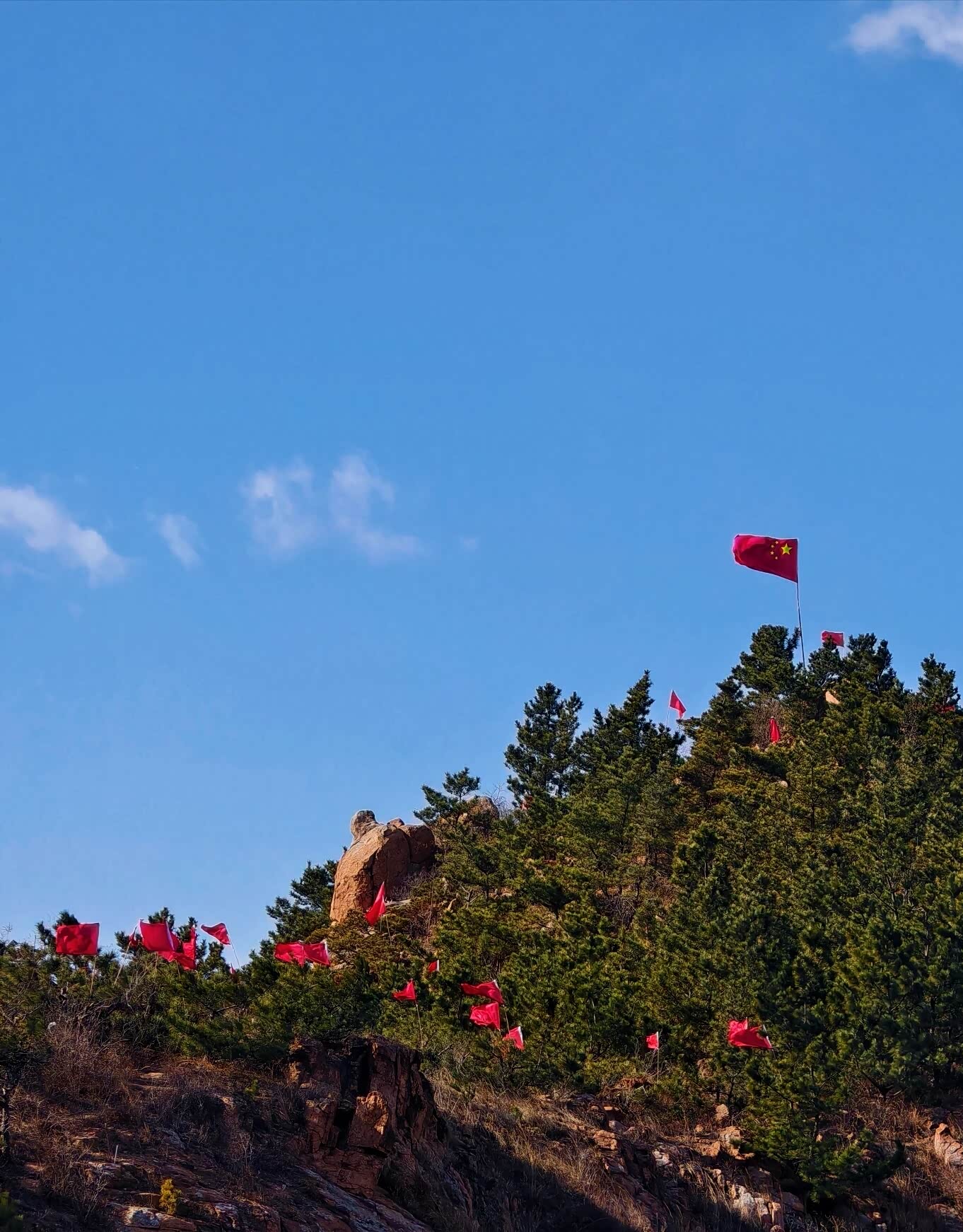 越往上走,风越大。带着松针气息的风灌进衣领,我把外套的拉链拉到顶。路过一处观景台时,我扶着栏杆往下望,能看见远处的崂山水库,像一块碎了的镜子嵌在群山之间。同行的小孩兴奋地喊着“看飞机”,一架民航客机正从城市上空缓缓飞过,在湛蓝的天空里留下一道淡淡的尾迹。快到山顶时,石阶变得陡峭起来。我一步一步往上挪,听见自己的心跳和呼吸声在风里格外清晰。终于登上顶峰时,整座城阳的城景在我眼前铺展开来。鳞次栉比的楼房、纵横交错的公路、远处若隐若现的胶州湾大桥,构成了一幅充满生机的城市画卷。山顶的红旗在风里猎猎作响,我伸出手去触碰那片红色,指尖传来布料被风吹得紧绷的质感。