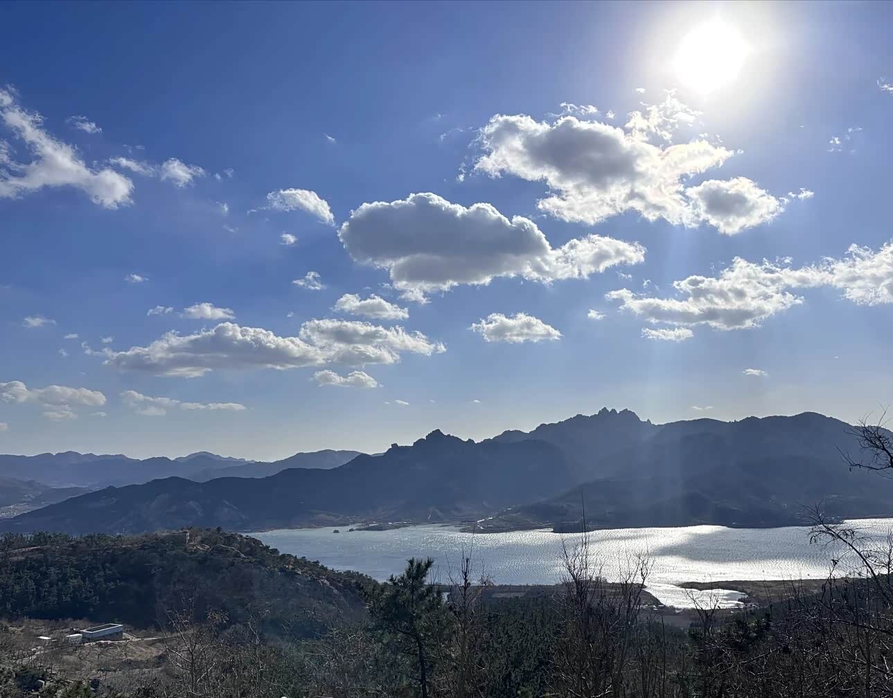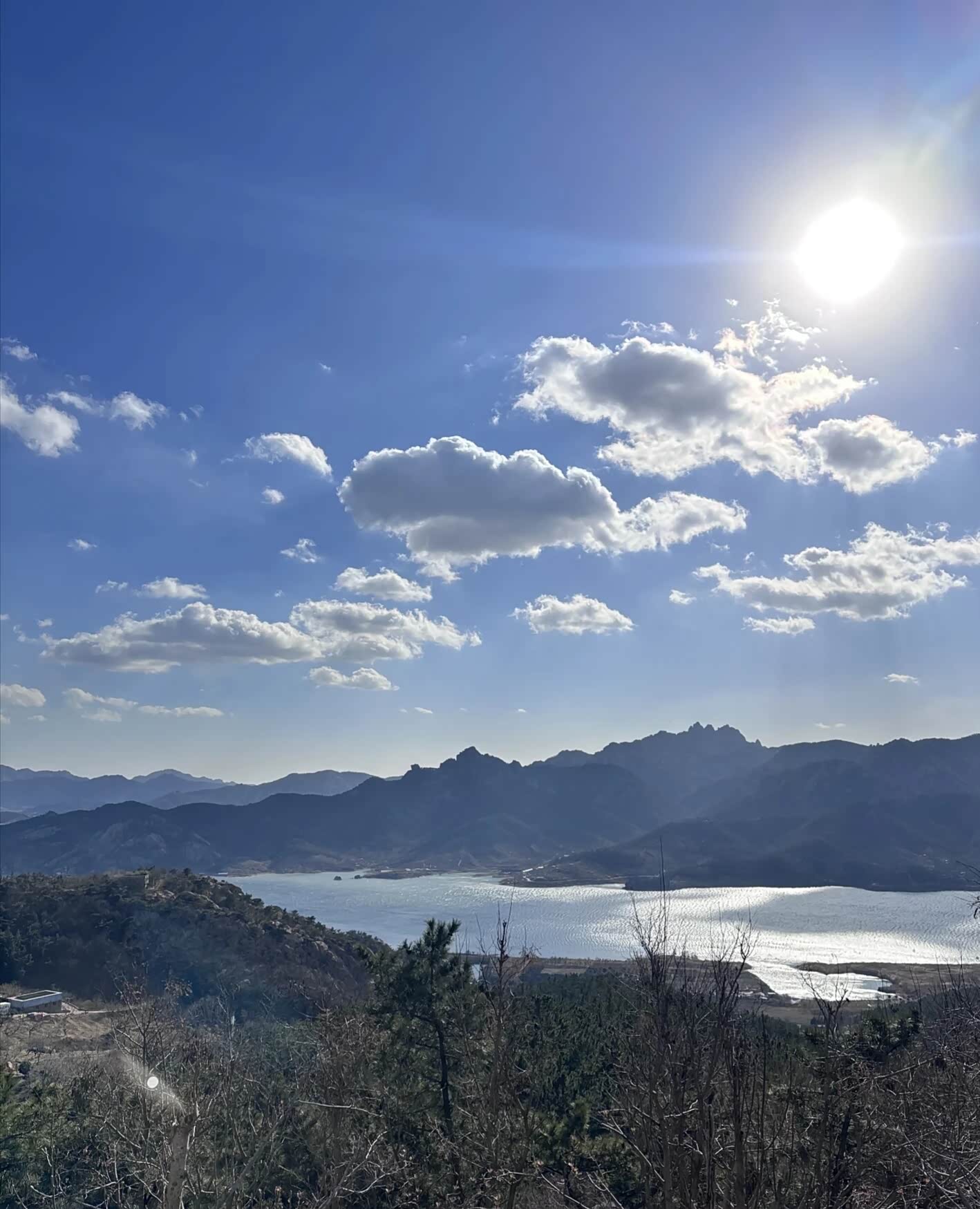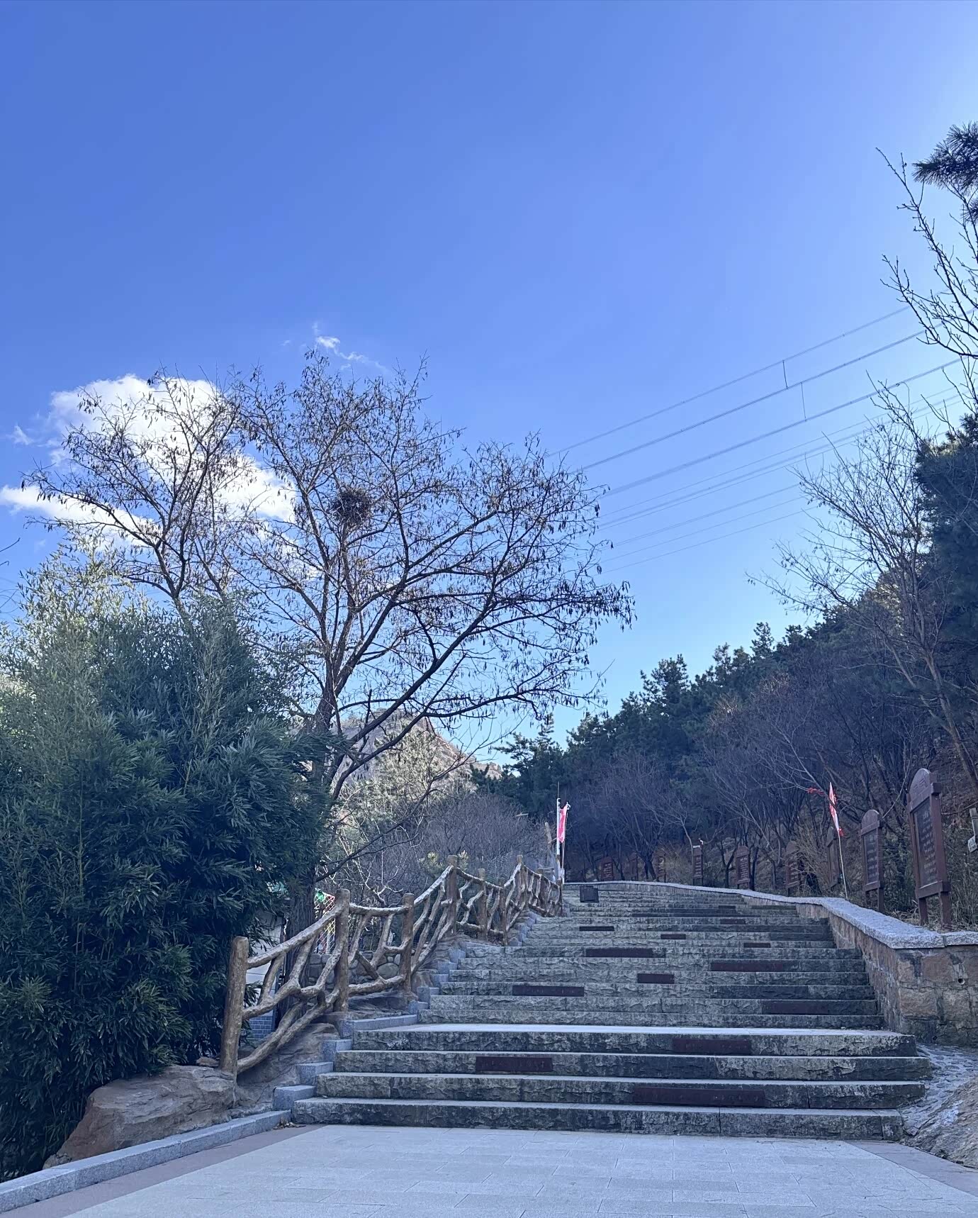 越往上走,风越大。带着松针气息的风灌进衣领,我把外套的拉链拉到顶。路过一处观景台时,我扶着栏杆往下望,能看见远处的崂山水库,像一块碎了的镜子嵌在群山之间。同行的小孩兴奋地喊着“看飞机”,一架民航客机正从城市上空缓缓飞过,在湛蓝的天空里留下一道淡淡的尾迹。快到山顶时,石阶变得陡峭起来。我一步一步往上挪,听见自己的心跳和呼吸声在风里格外清晰。终于登上顶峰时,整座城阳的城景在我眼前铺展开来。鳞次栉比的楼房、纵横交错的公路、远处若隐若现的胶州湾大桥,构成了一幅充满生机的城市画卷。山顶的红旗在风里猎猎作响,我伸出手去触碰那片红色,指尖传来布料被风吹得紧绷的质感。