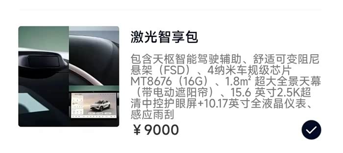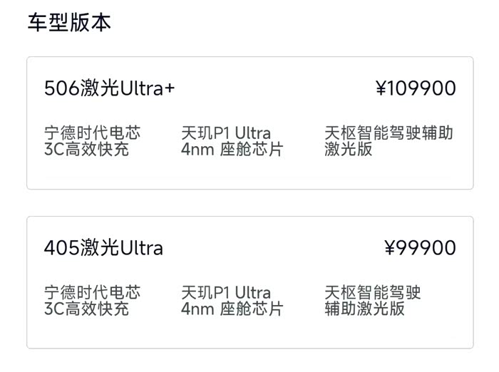 但要注意的是,这套硬件只有售价10.99万元的506激光Ultra+版才是满血版。506Max版可以花9000元选装的“激光智享包”里虽然包含了同款芯片,但是明确标注了运存只有16G,405激光Ultra版也只有16G运存。