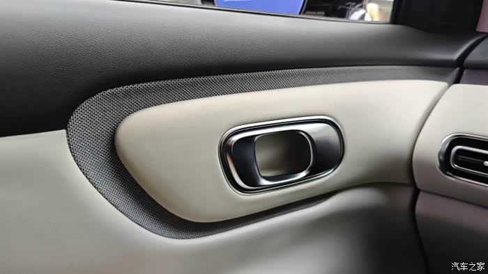 然后是从仪表台一直延伸到车门板上的编织网格,有那么一点点设计感,配合漫反射的氛围灯,看着就有点超越这个价位了。