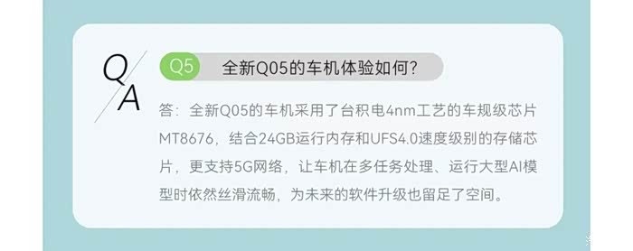 比较可惜的是,无论是A06还是Q05我都没有试过辅助驾驶模式。而且,让我比较纳闷的是,明明这两台车的辅助驾驶软硬件看起来几乎完全一样,都是基于地平线J6M芯片的方案,但Q05却只支持高速路领航,不支持城市领航,难道是为了维护A06这个大哥的面子强行阉割?