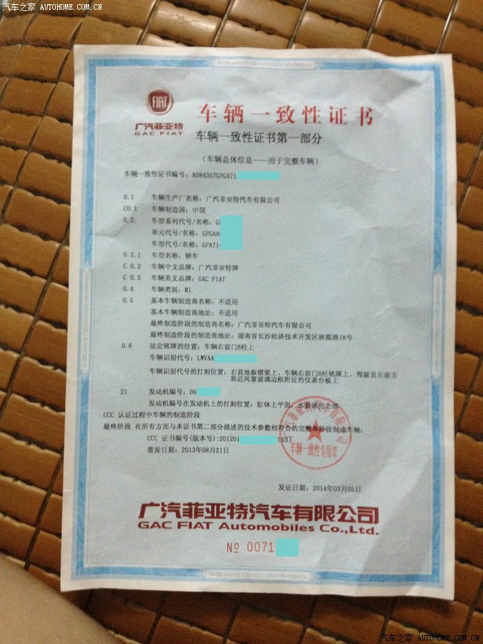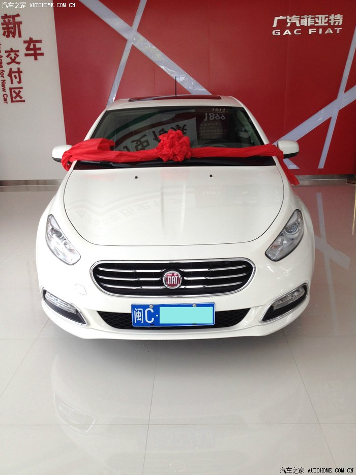 5.后来听朋友说菲亚特菲翔不错,安全,配置不错,性价比高。在此之前,完全不知道菲亚特这品牌,回家各种视频***各种补,才知道是意大利著名汽车制造公司,法拉利、玛莎拉蒂、克莱斯勒、Jeep、道奇是它旗下的品牌,后来研究菲翔的性价比跟安全配置就一发不可收拾,完全着迷了。虽然知道菲翔有写小毛病,但我也一直认为买车是靠人品的,只要质量不是非常严重,小毛病是可以接受的。等到周末,自己一个人跑去店内看,得知邻居有一辆菲翔红色顶配,就去借来在空地开过她的车两次,一直没去过4S试驾过,后来也就这么冲动的把车给买了,想想也是太随便了,这是菲翔的魅力吗。销售跟我说7.20什么六省团购活动,优惠史无前例什么的一大堆,7.20刚好也是周末不用上班,就稀里糊涂交了3000元订金跟着去福州团购会了,我决定要买的是劲享版,优惠2万,中间还有一个手机小游戏优惠500元,去参加团购会的每人都送了一个充电宝(到今我还不敢用,对质量表示怀疑)。我是全款买车的,后来要提车送了些东西,团购会期间没有拍照,也没中奖,可惜了。车款很早就付了,只是等选一个好日子去提车,等车日子很煎熬的,刚提车后就买了行车记录仪,一个一托三点烟器,一个鲨鱼腮天线,一对排骨靠枕,一个遮阳挡板。后续想改导航倒车影像,改红色恶魔灯等等,慢慢来吧。。。(发现有几个错别字,不改了,各位见谅~!)