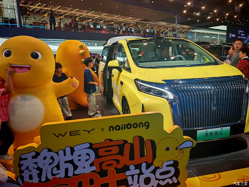 一进入1号馆门口,一抹黄色的宝宝巴士映入眼帘,咋眼一看咋很像高山8呢!瀑布式前脸,激光雷达,到尾部一看HI4T,魏牌高山7。