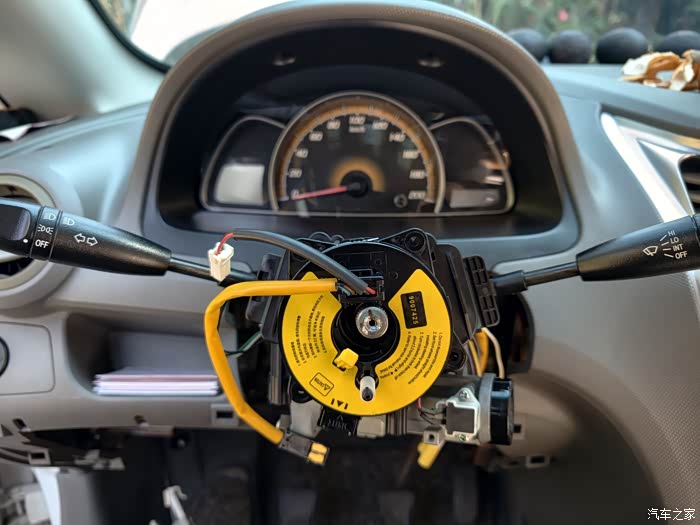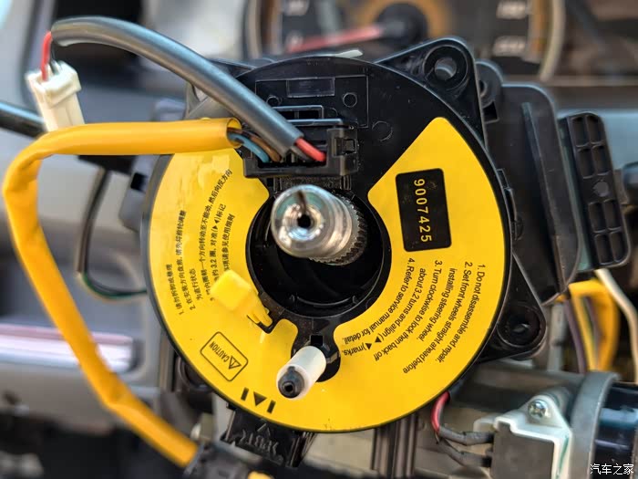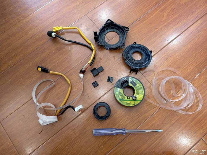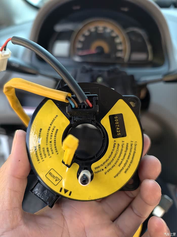 上网在一家老店订了一个库存原装的游丝,等待几天后配件终于到货,立马动身维修。步骤依次是,拆方向盘两边的盖子,拧下螺丝,断开气囊接口,整个方向盘盖取走,拧下中间的方向盘固定螺母,取走方向盘,在取方向盘这一步最麻烦,非常耗时。因为是第一次拆,方向盘在没螺母固定的情况下都非常的紧。出动脱扣的拉马、锤子、翘棍,一个小时下来丝毫没动,让人绝望。休息过后,索性用蛮力,紧抓着方向盘左右上下的摇,十多分钟后果真有效,终于能取下来。接着拆开塑料盖,脱下游丝的气囊和喇叭线接扣,取下旧游丝盘,把新的装上,接线,取下游丝的黄色限位条,依次把东西装好,测试喇叭能正常响,顺便改了一下机仓的喇叭接线,把另一边的喇叭也安装上(赛欧原厂只有一边喇叭),一对喇叭响才是正常声音。